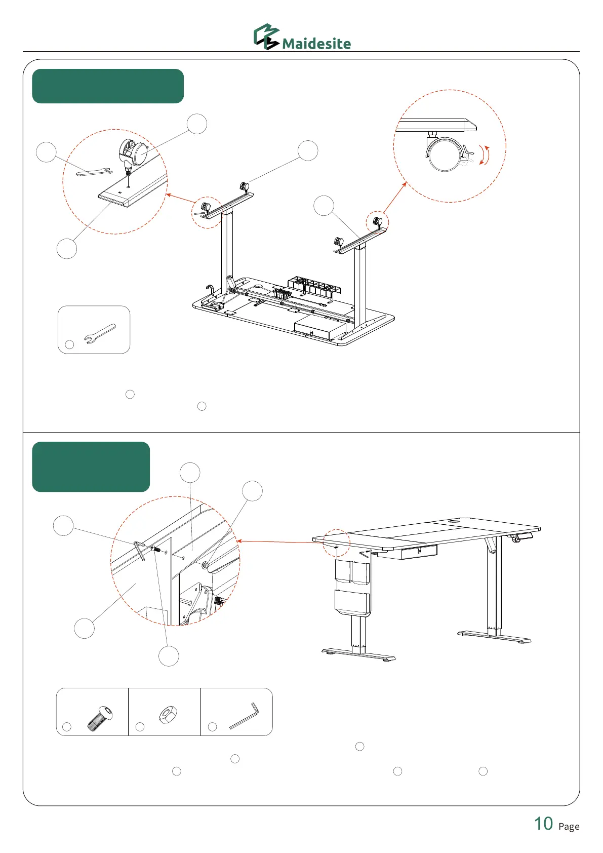 To use casters , first, turn the rubber pads on the desk feet counterclockwise to remove them, and then