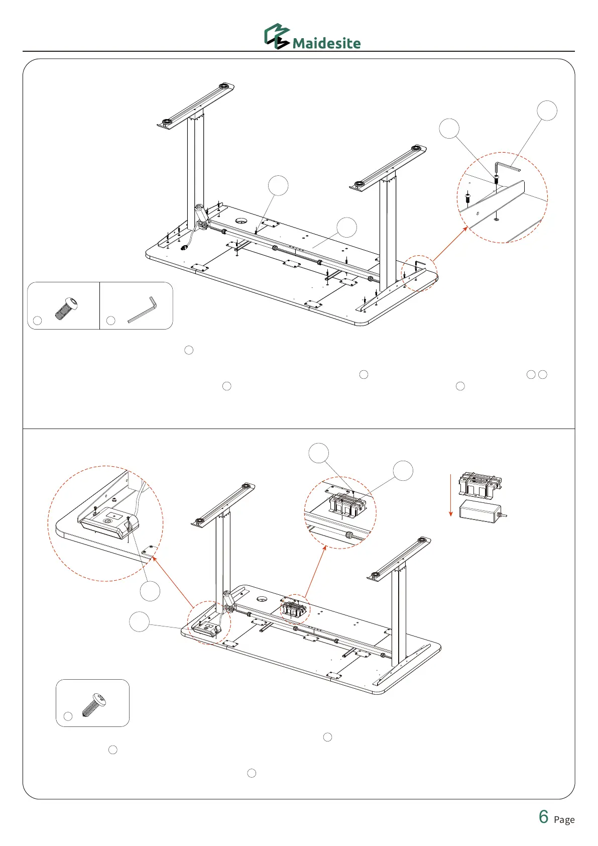 Next, place the desk frame upside down on the desktop. The pre-embedded screw holes on the desktop