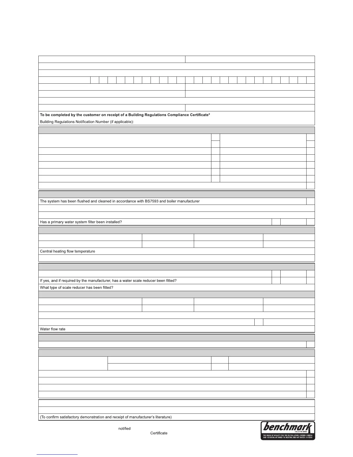 The manufacturer’s literature, including Benchmark Checklist and Service Record, has been explained and left with the customer Yes
