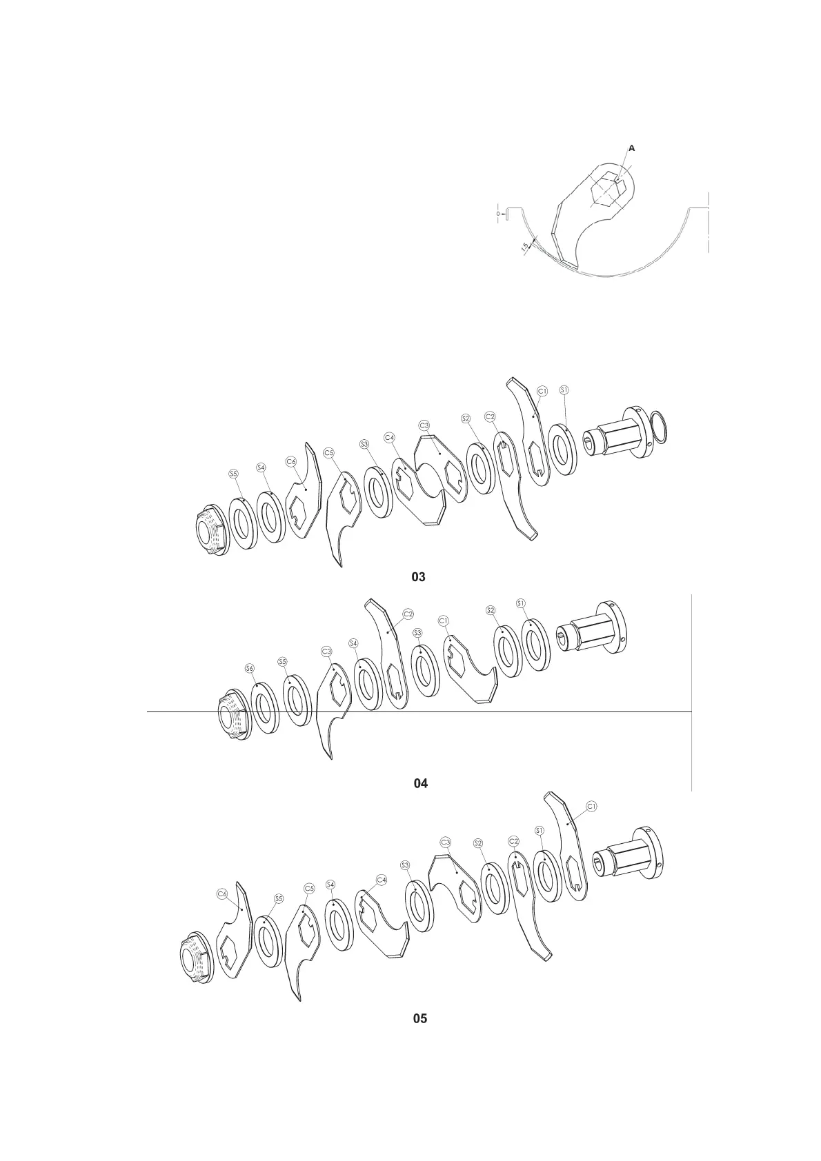 Bemærk, at hver enkelt kniv er forsynet med en styrenot ( A ) i den