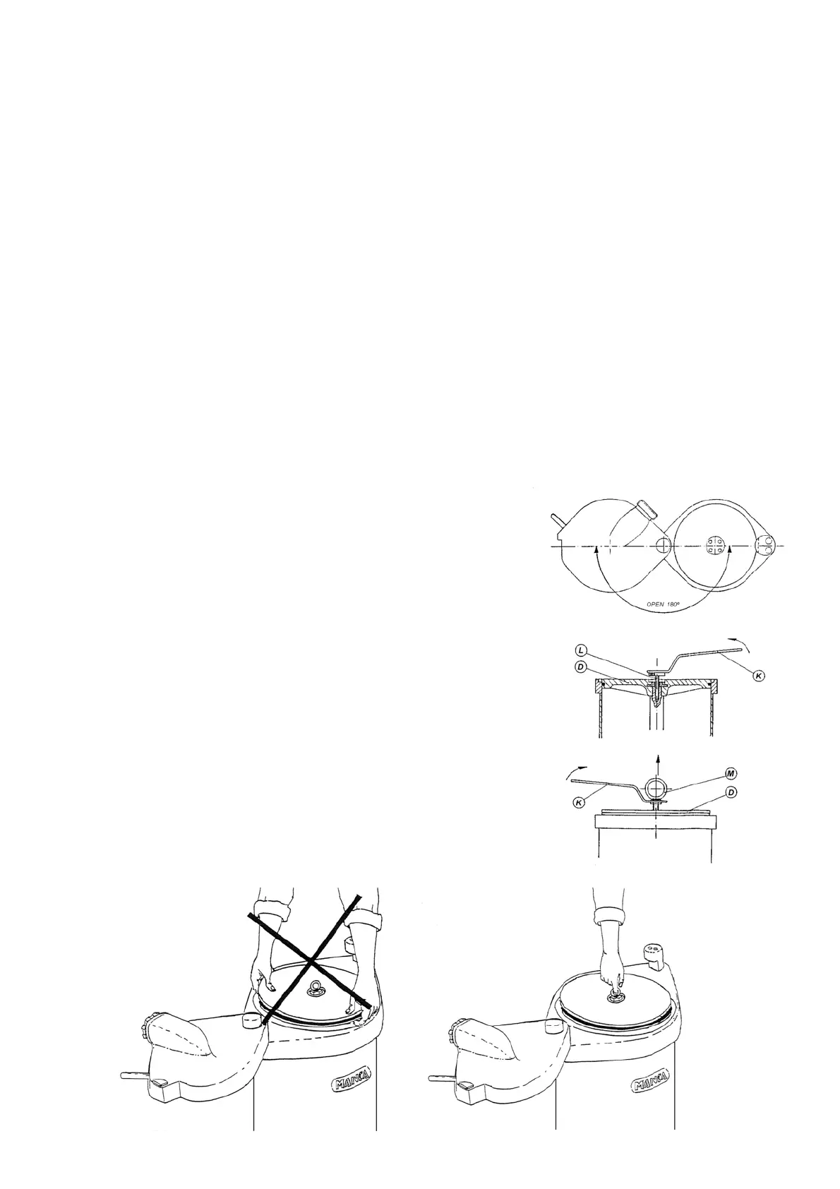 Öffnen Sie den Deckel (F), befeuchten Sie die Dichtung (H) mit Wasser (um das Schließen zu erleichtern und