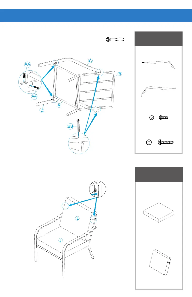 4. Place Seat Cushion(J) and Back Cushion(L)