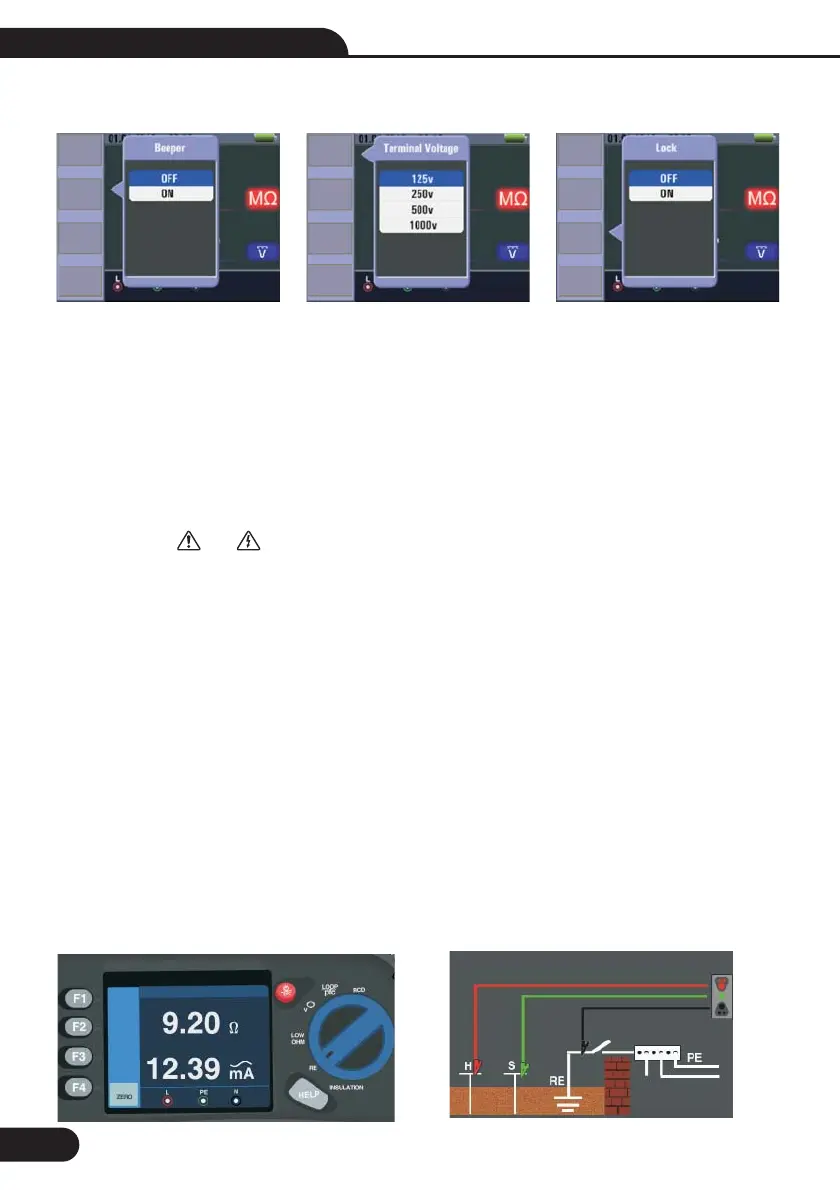 4 Use the F1 to select the test voltage. Most insulation testing is performed at 500 V, but observe local test