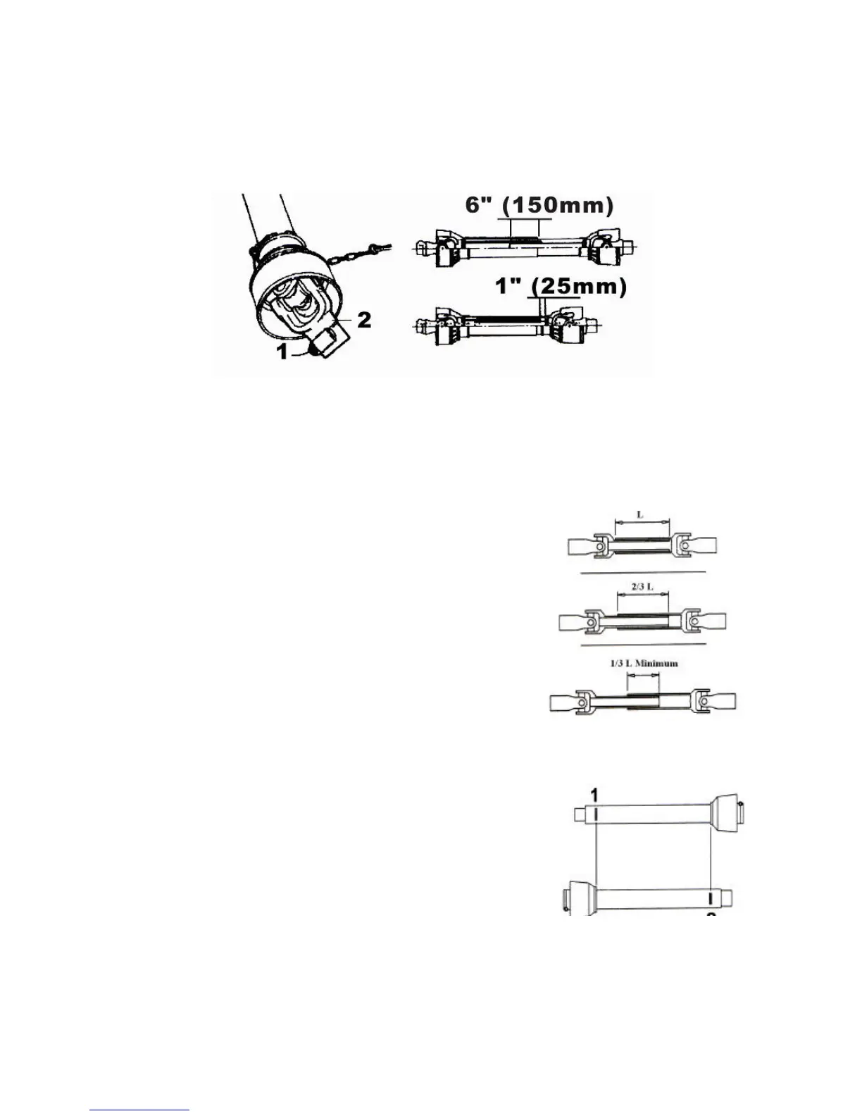 The minimum coupling length must be no less than 150 mm (6 inches) in each work position. Driveline travel