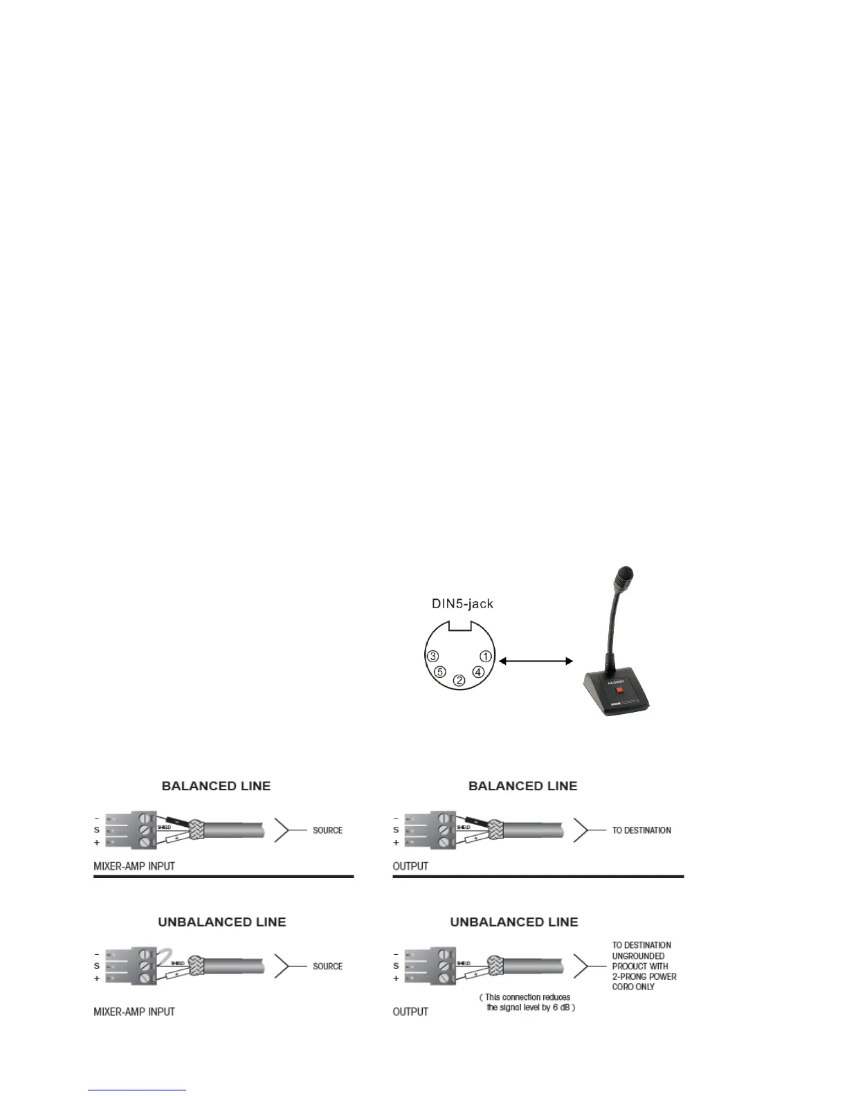 The microphone inputs use DIN-5 jack and are balanced. Priority operation can be