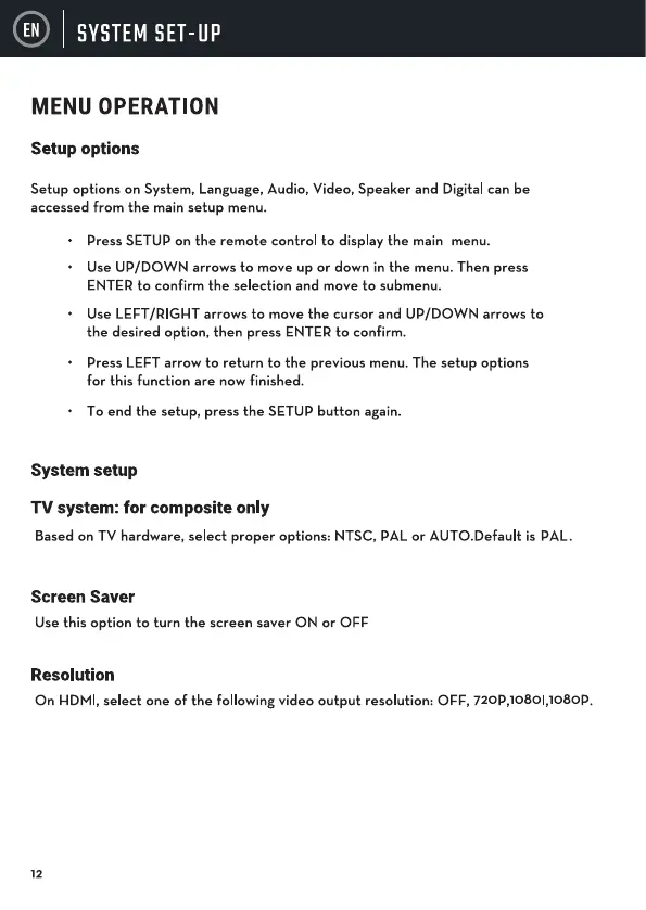 Setup options on System, Language,Audio, Video, Speaker and Digital can be