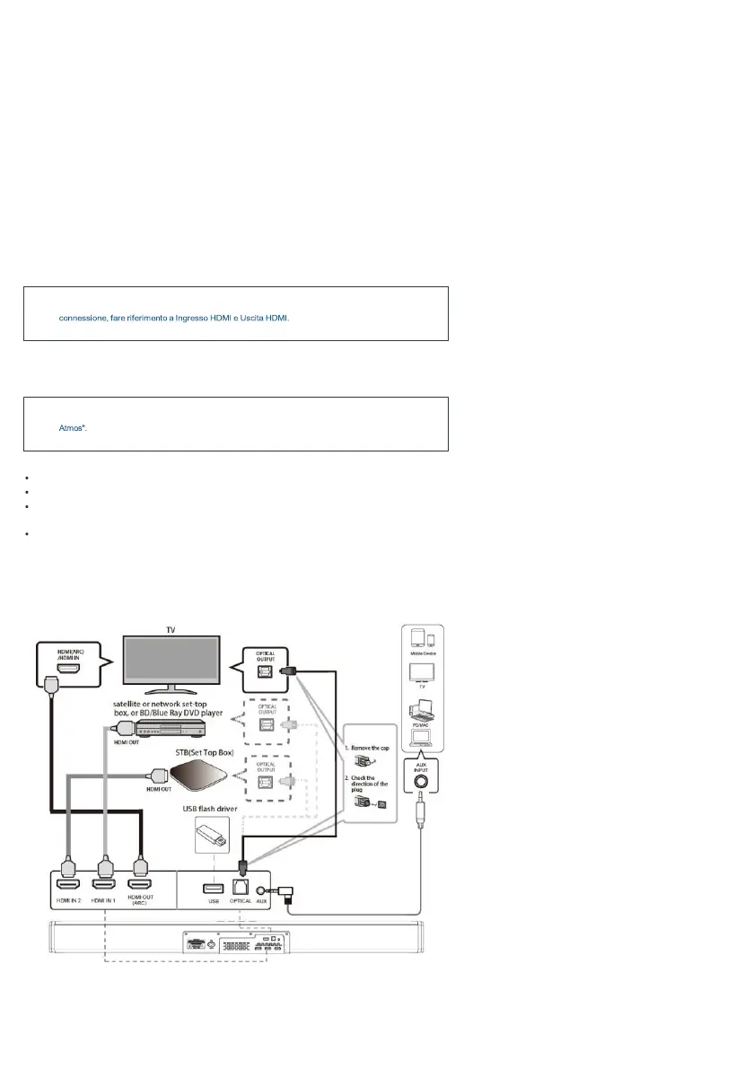 Per utilizzare Dolby Atmos in modalità HDMI 1 / HDMI 2 / HDMI ARC, il televisore deve supportare Dolby Atmos. Il lettore UHD (Ultra-High-Definition)/Blu-ray o la TV deve avere le