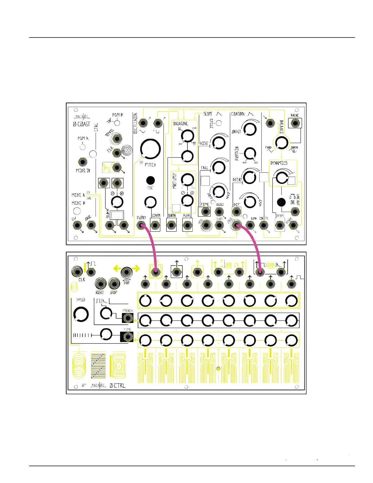 To sequence a 0-Coast with the 0-CTRL, start the Clock by pressing the Clock button, patch the Pitch CV