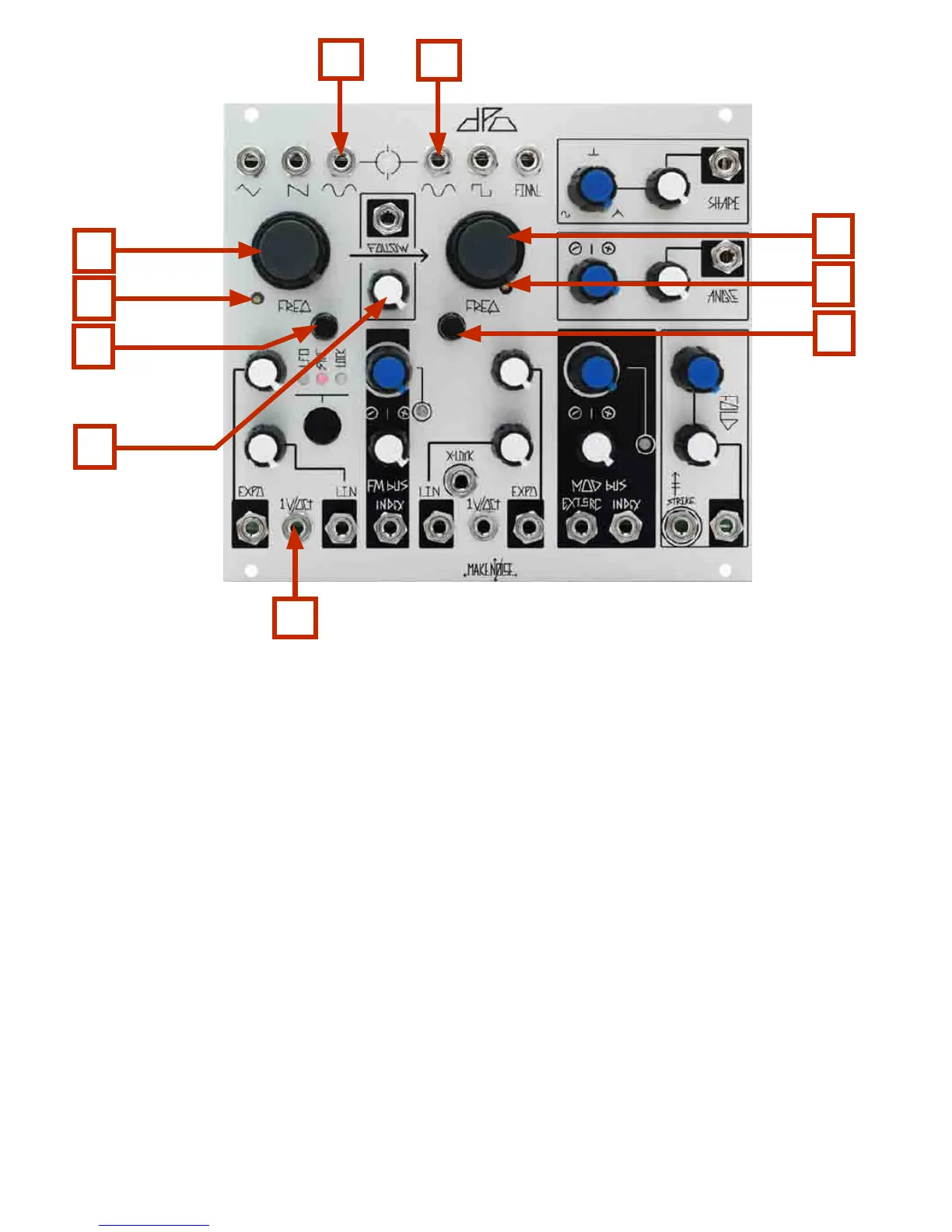 8. Monitor VCO A and B SINEs. Patch or Midi to CV to VCO A 1V/ Octave INput (6), and FOLLOW (5)