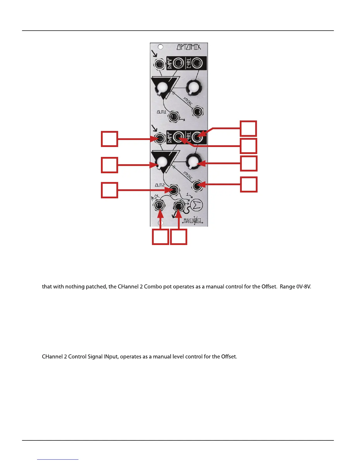 12. CHannel 2 CONTROL Combo Pot: Unipolar attenuator for CHannel 2 CONTROL Signal INput. With nothing patched to the
