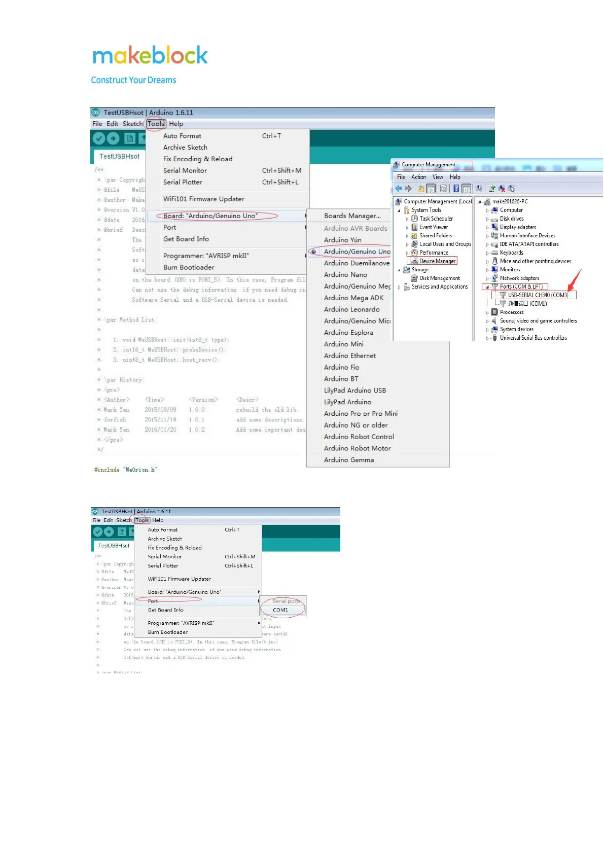 Go to Tools->Port, then choose the correct serial port for your robot. You can