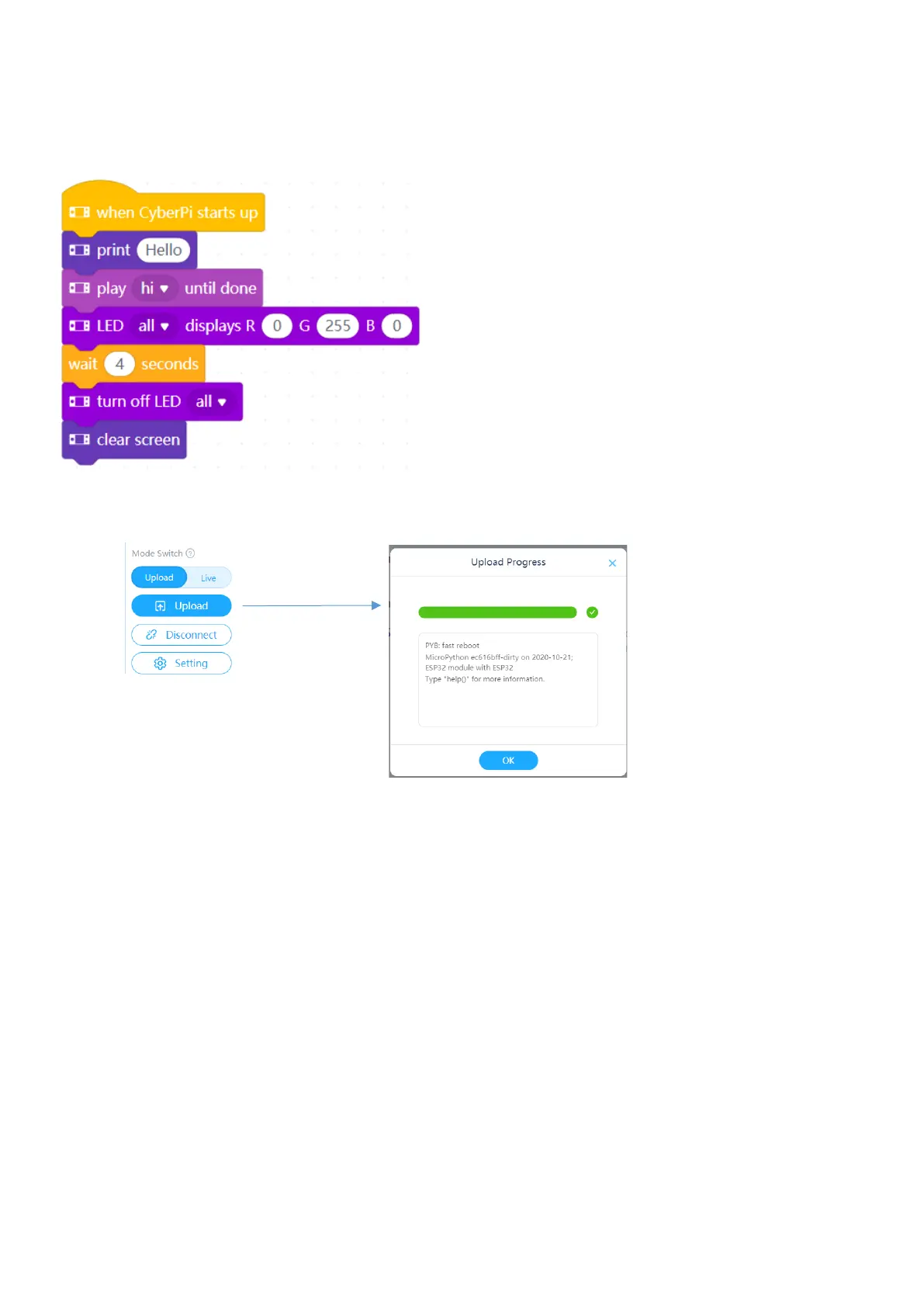 Click the Upload button to send your code to the mBot2.