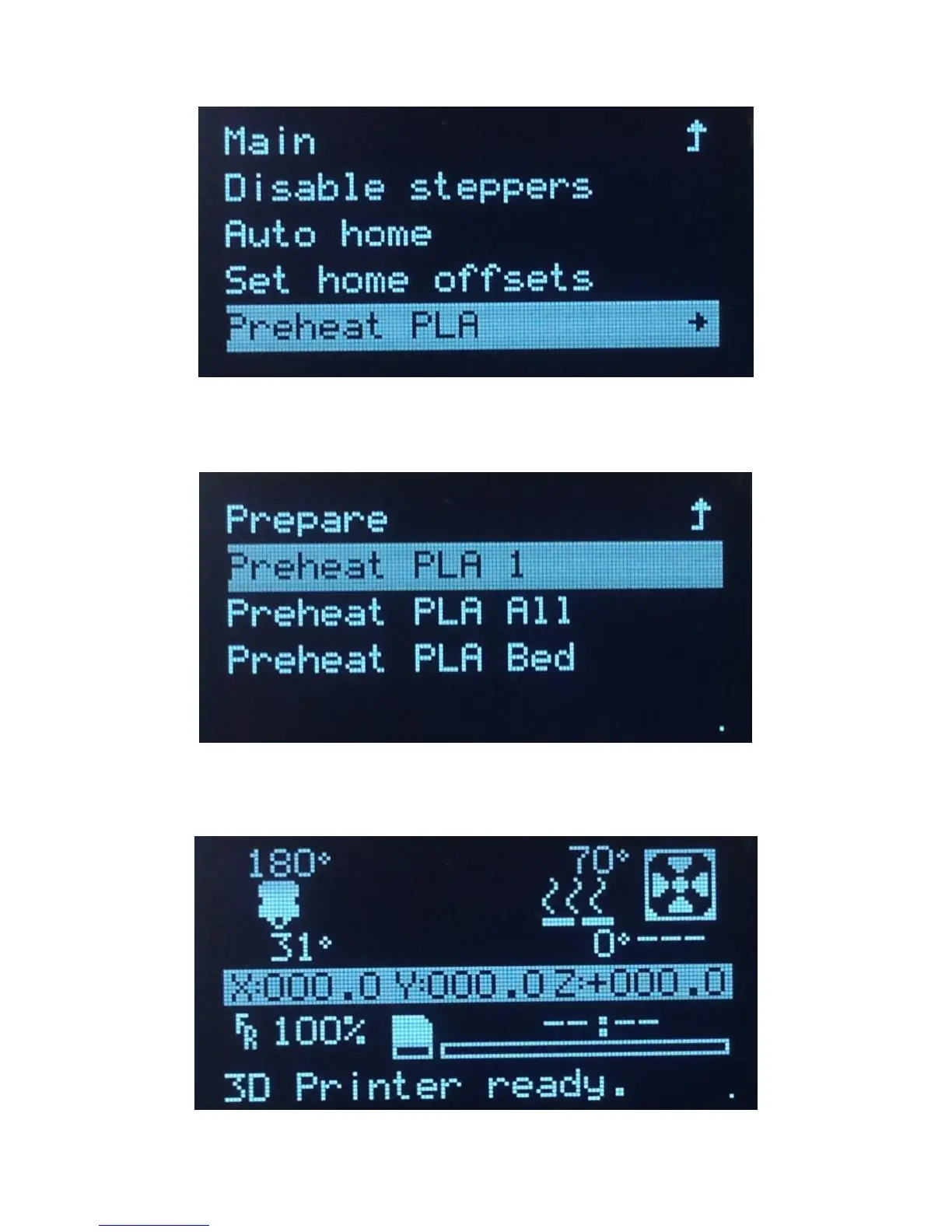 7. Rotate the knob clockwise, choose "Preheat PLA1" and press the knob