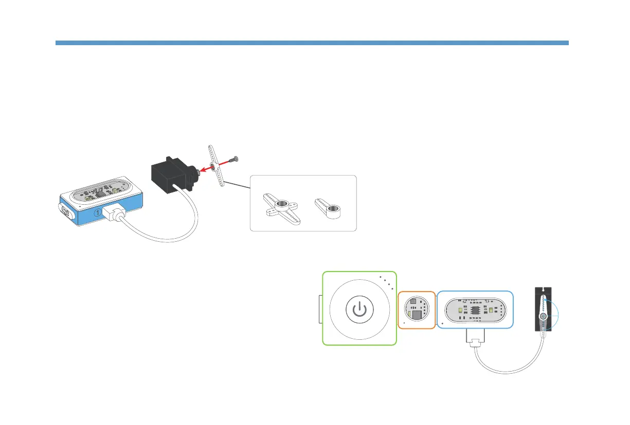Get the servo pack and install servo hub as shown in the 󽗉gure below. Then plug the servo into the slot.