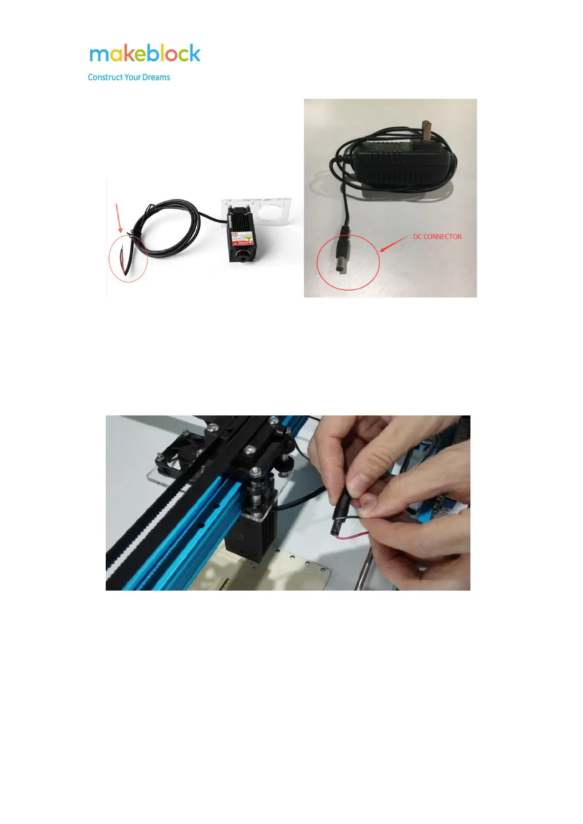 Only put red wire metallic part inside of the DC connector interface, the laser is