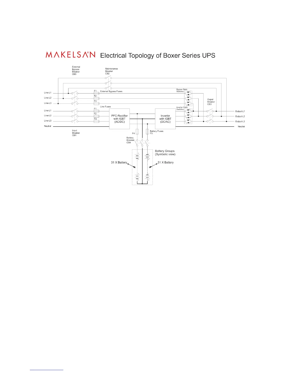 General operation topology of Boxer Series UPS can be recognized as follows: