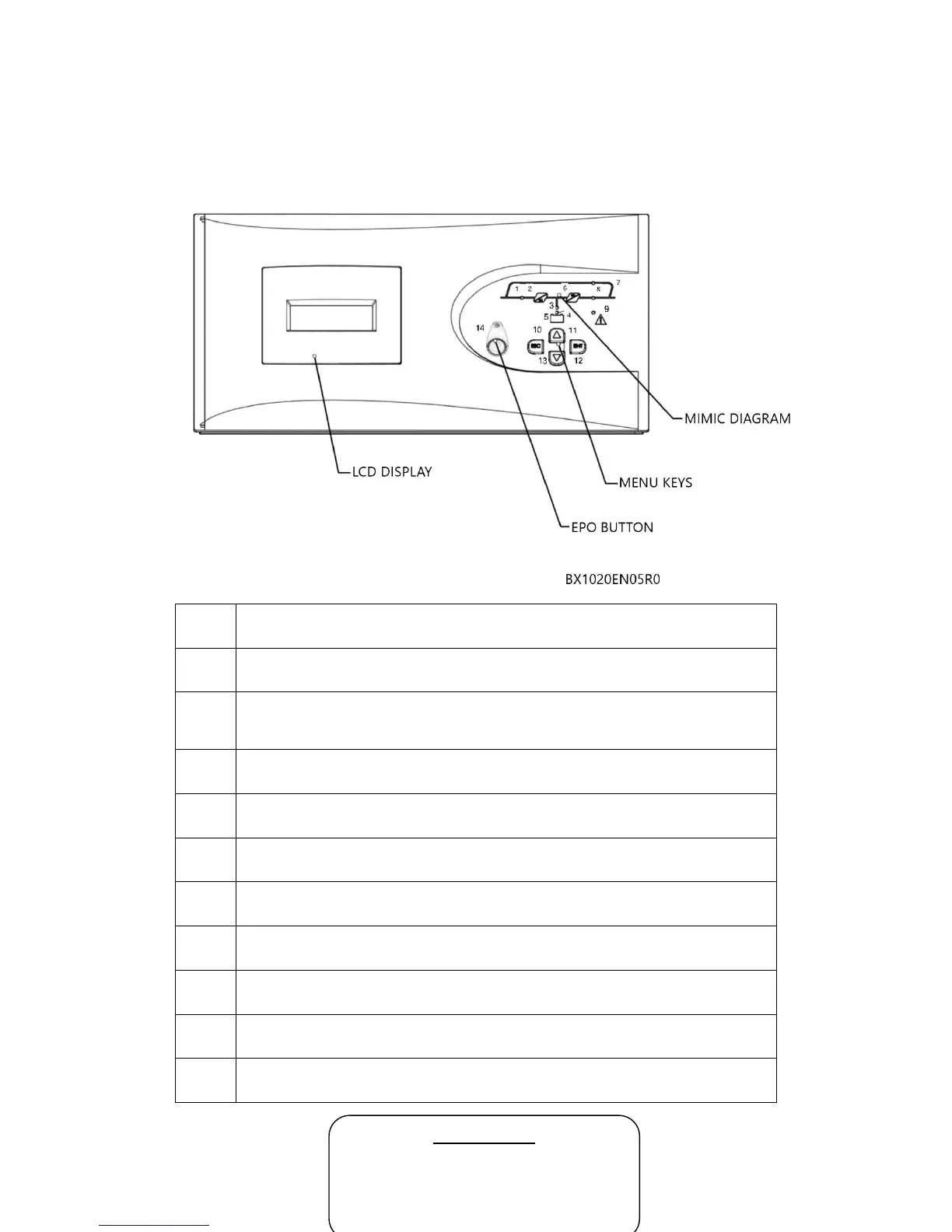 User panel consists of mimic diagram, LCD screen, EPO button and menu keys. The UPS can be