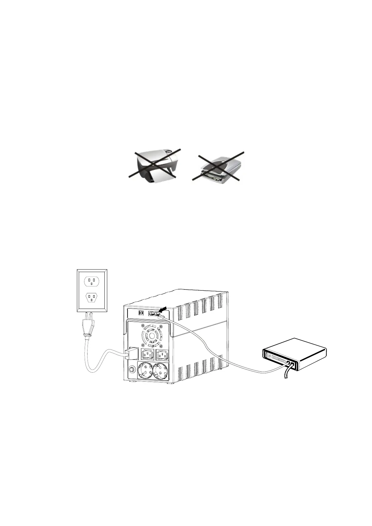 COUTION: Never connect a laser printer or scanner to the UPS unit, because in-rush current