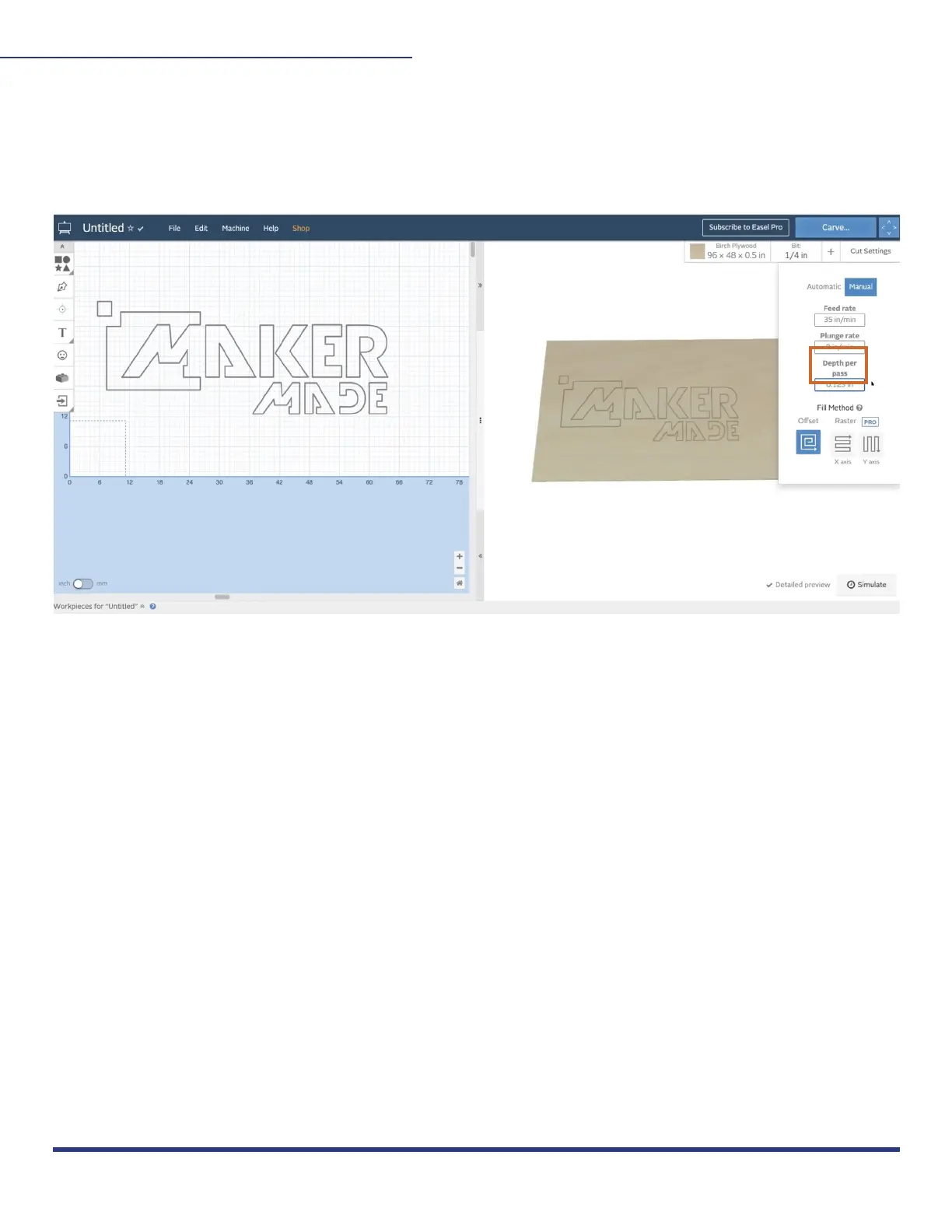 your bit diameter. Here, we have a 1/4in bit, so we changed our Depth per pass to 0.125