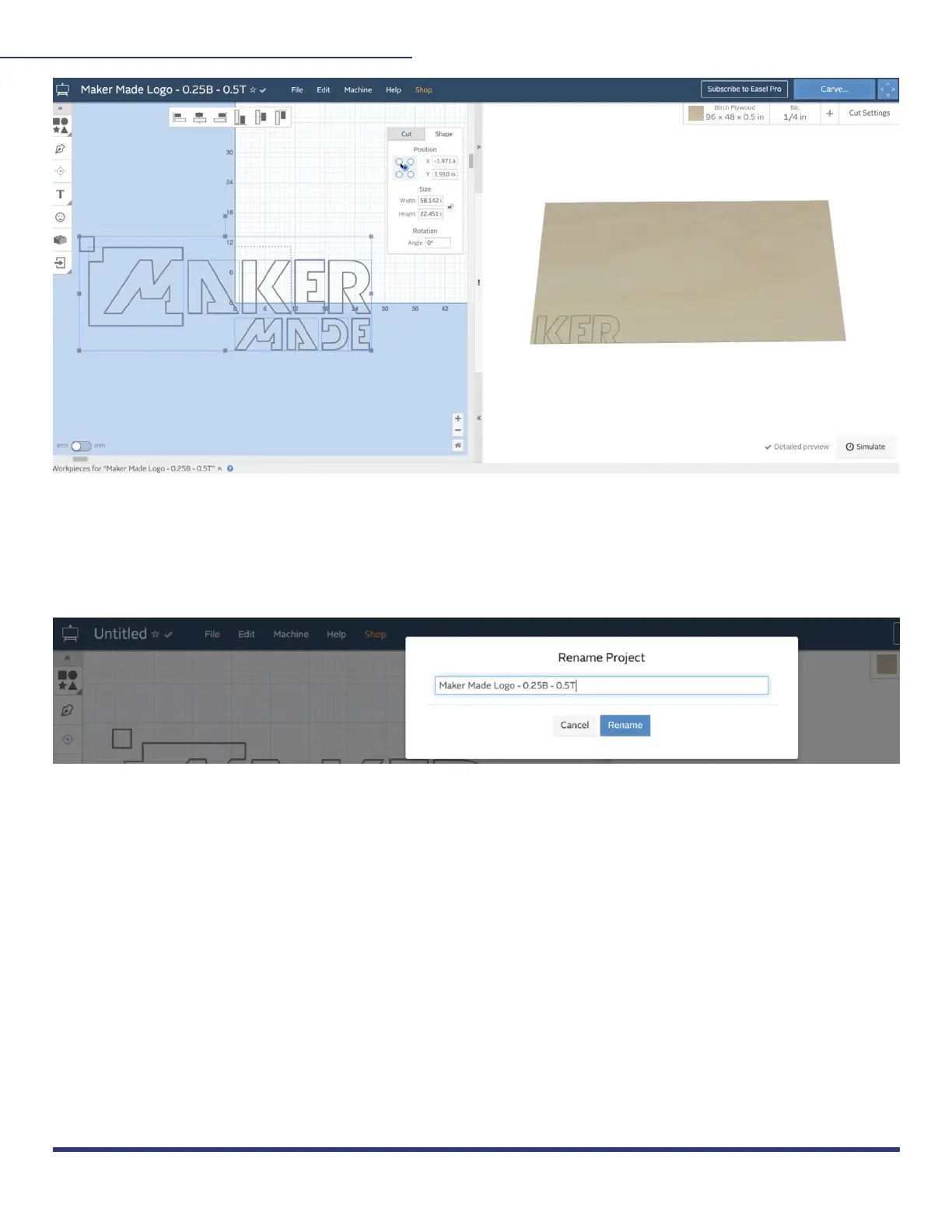 with the bit size and thickness of the material. Click “untitled” in the menu bar to change the