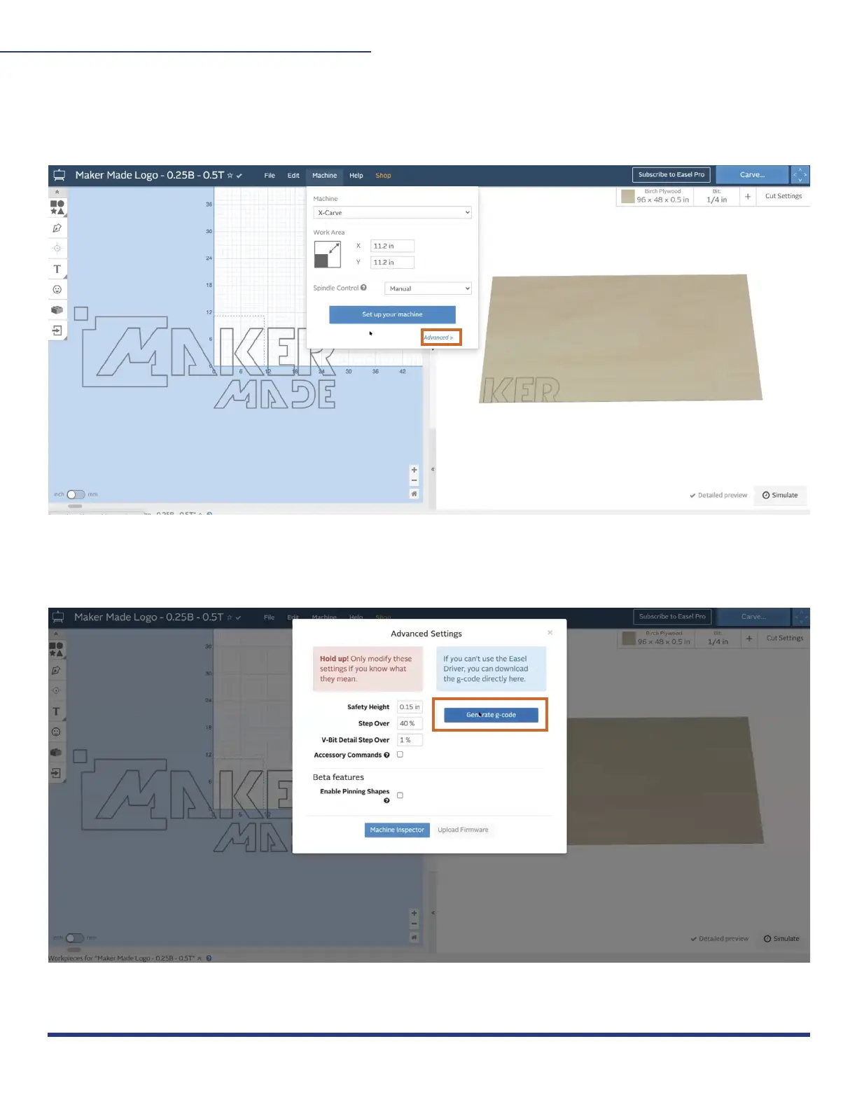 To generate your Gcode to cut, click “Machine” > “Advanced” to bring up the Gcode menu.