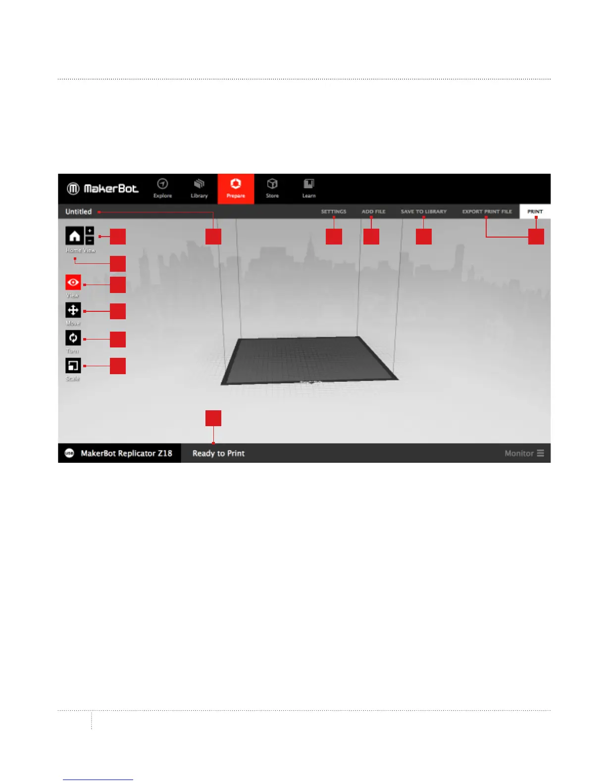 • • Click the Home button to reset MakerBot Desktop to the default view of the build plate.