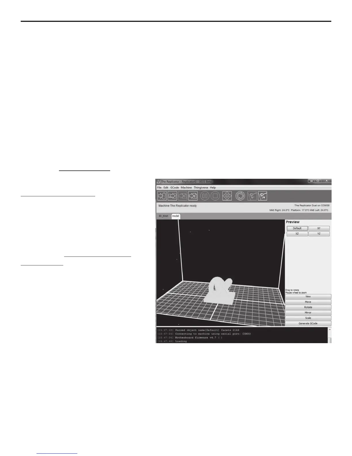 ReplicatorG is software that allows you to prepare new prints for The Replicator. You’ll need to