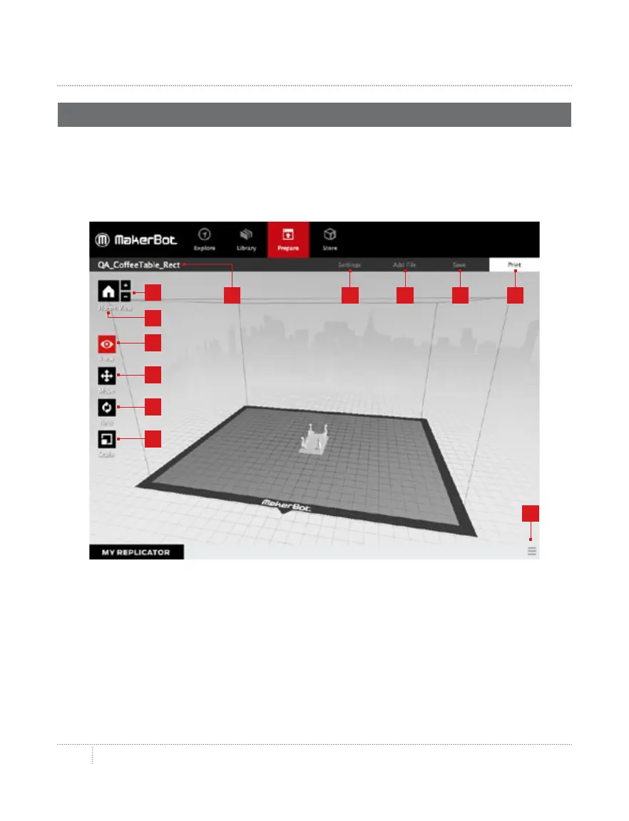 • • Click the Home button to reset MakerBot Desktop to the default view of the build plate.