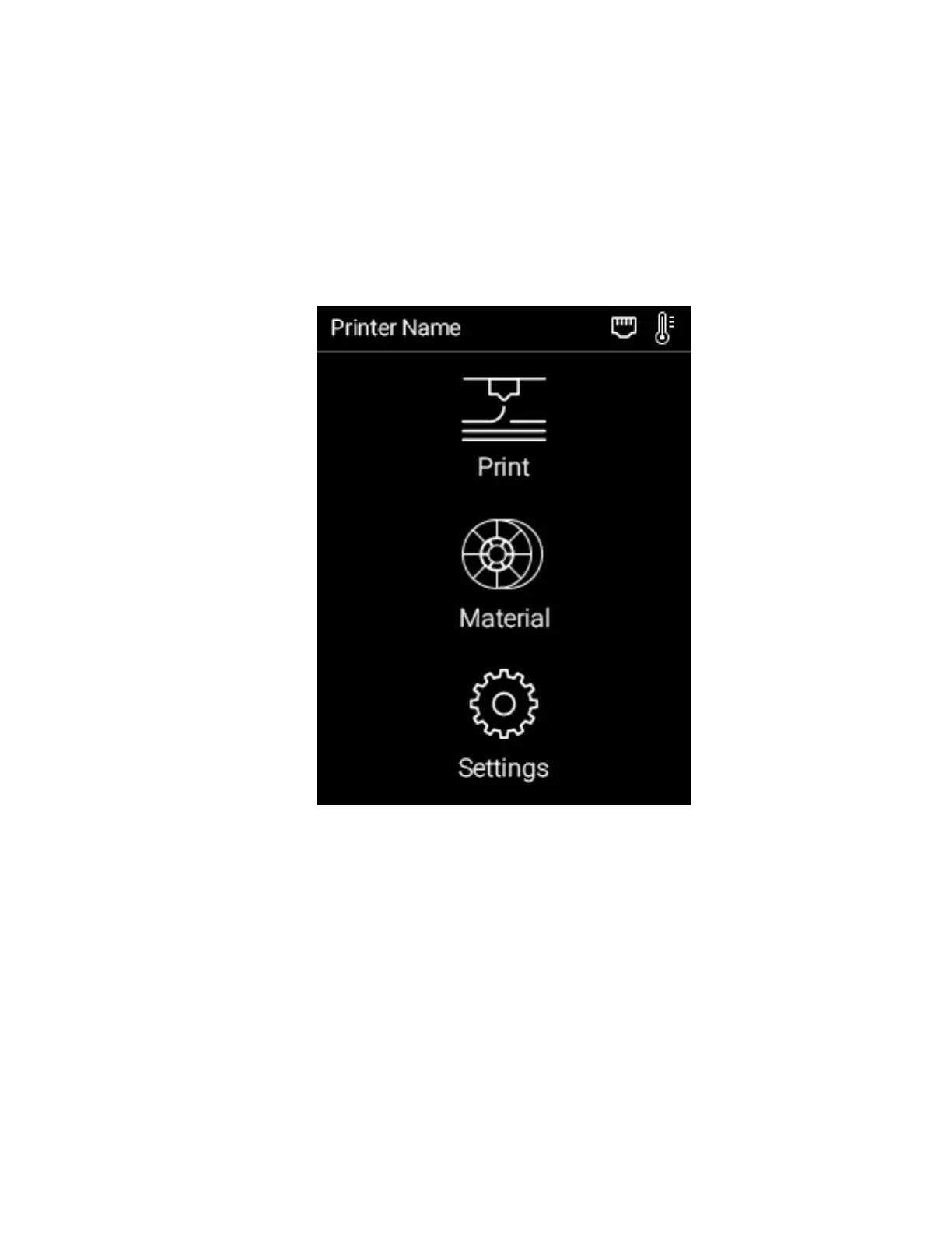 MakerBot Sketch - HOME SCREEN; Print Functionality; Material Management Access; Settings Access