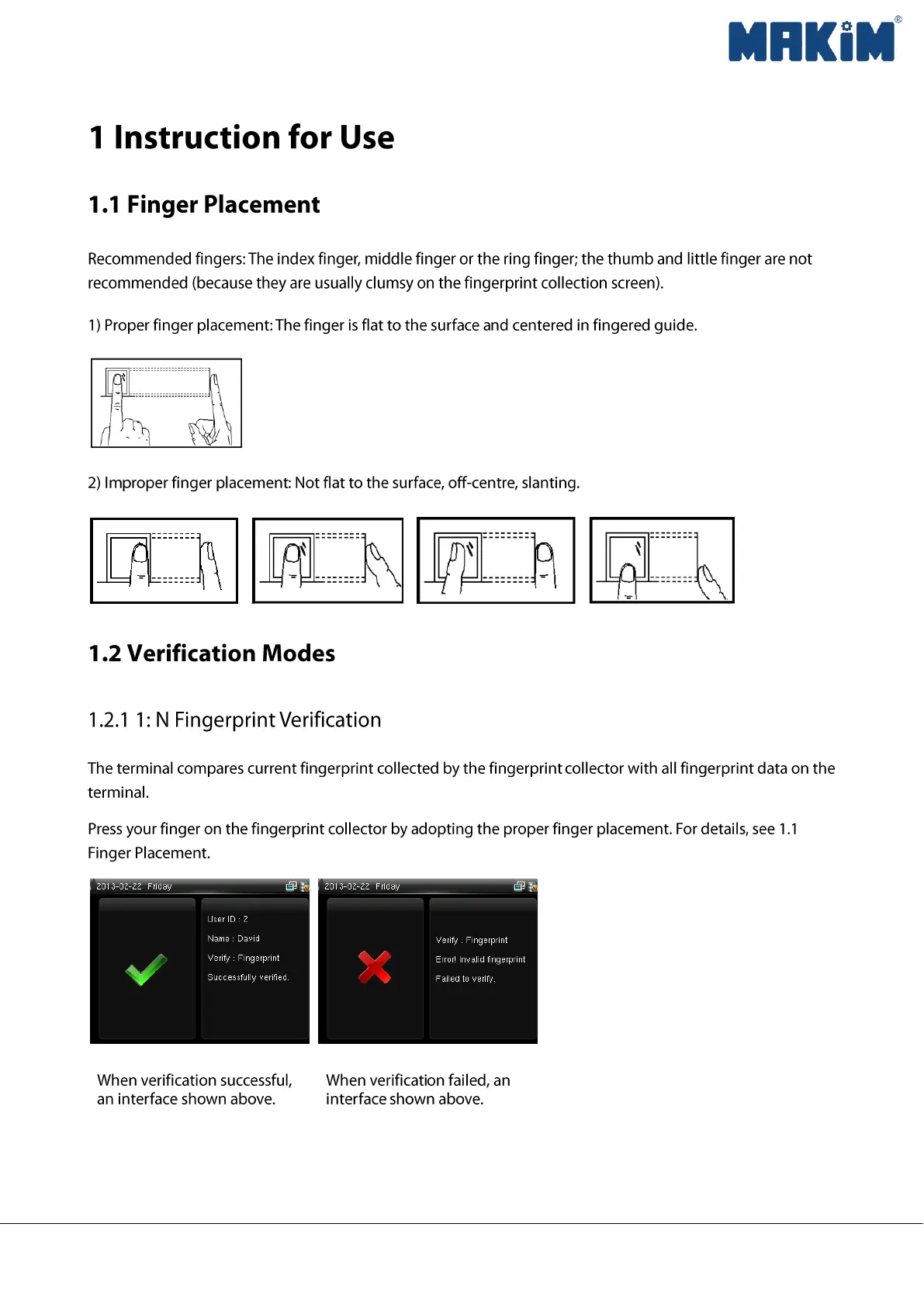 Makim D20 - 1 Instruction for Use; 1.1 Finger Placement; 1.2 Verification Modes