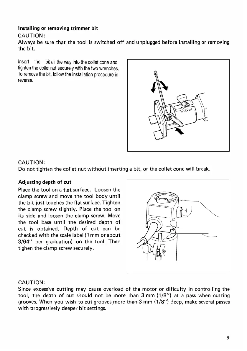 Makita 3701 - Makita Trimmer Operation and Setup; Installing or Removing Trimmer Bit; Adjusting Depth of Cut