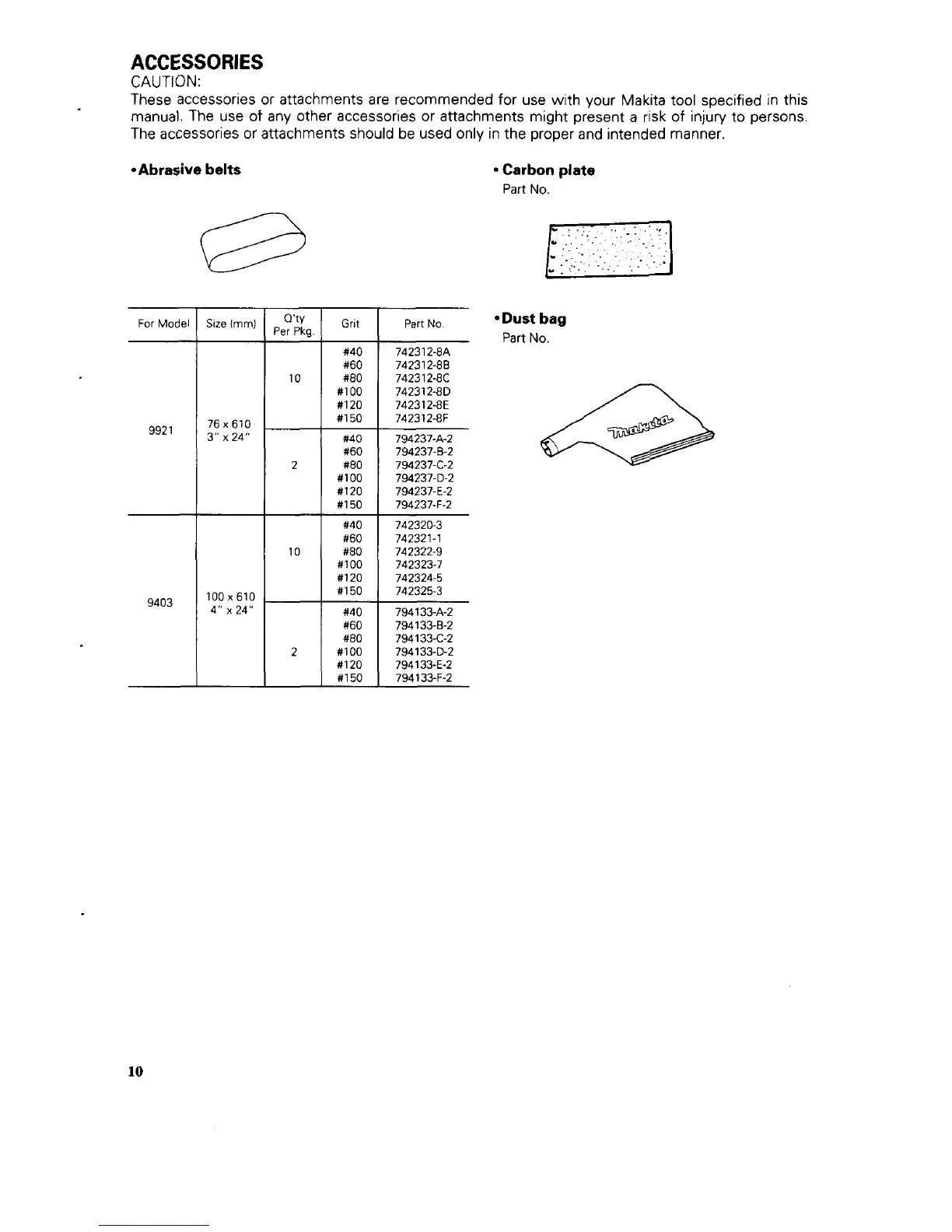 Makita 9921 - Accessories; Abrasive Belts; Carbon Plate Accessory; Dust Bag Accessory