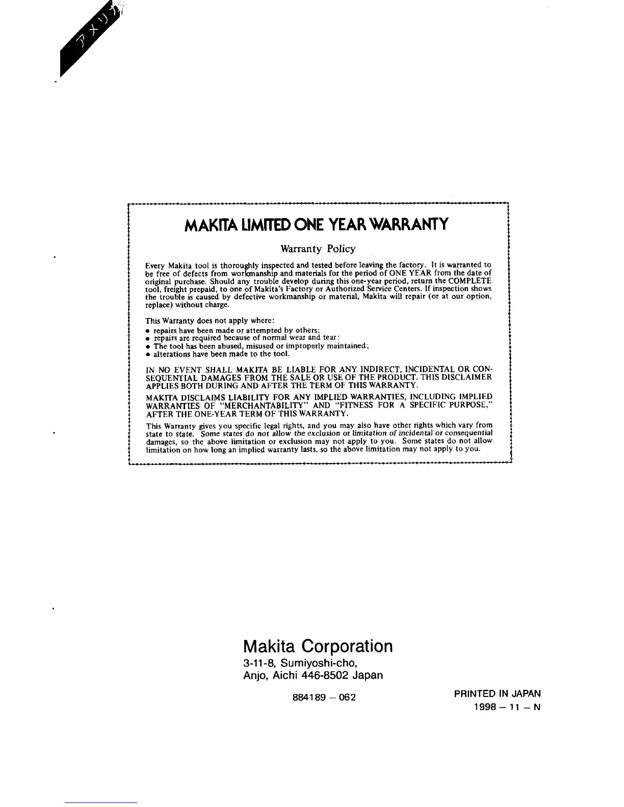 MAKITA DISCLAIMS LIABILITY FOR ANY IMPLIED WARRANTIES, INCLUDING IMPLIED