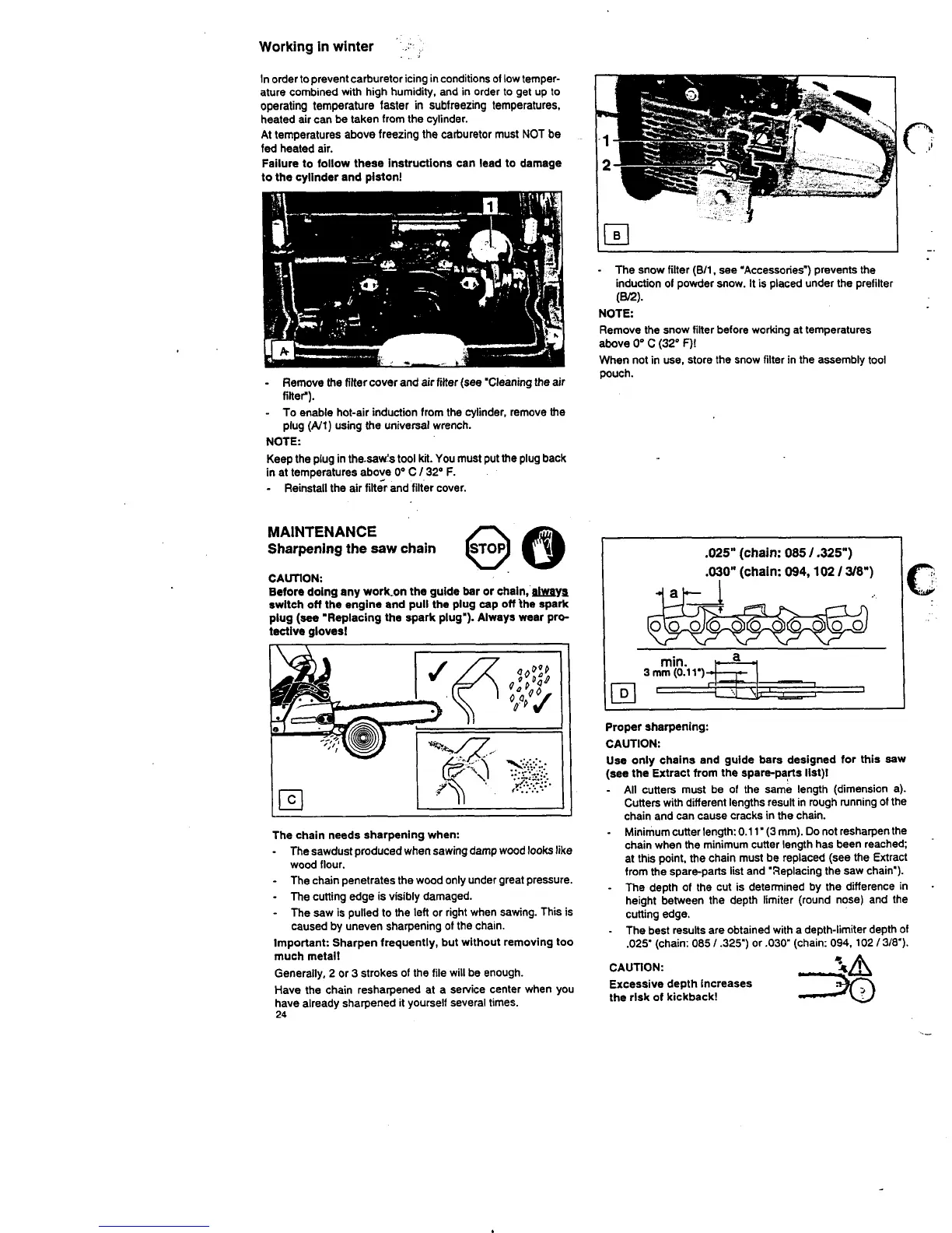 from the spareparts list and 'Replacing the saw chain').