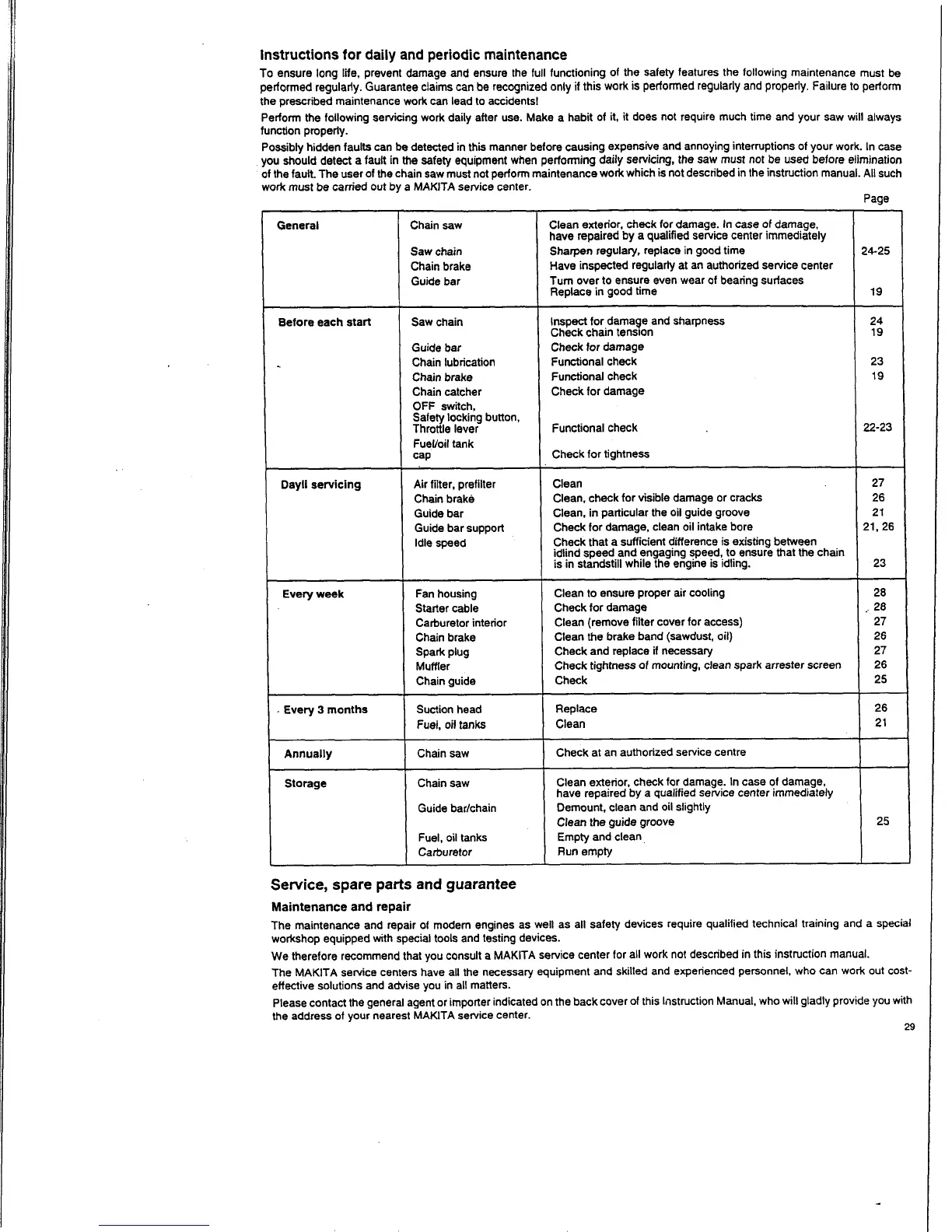 of the fault. The user of the chain saw must not perform maintenance work which is not described in the instruction manual. All such