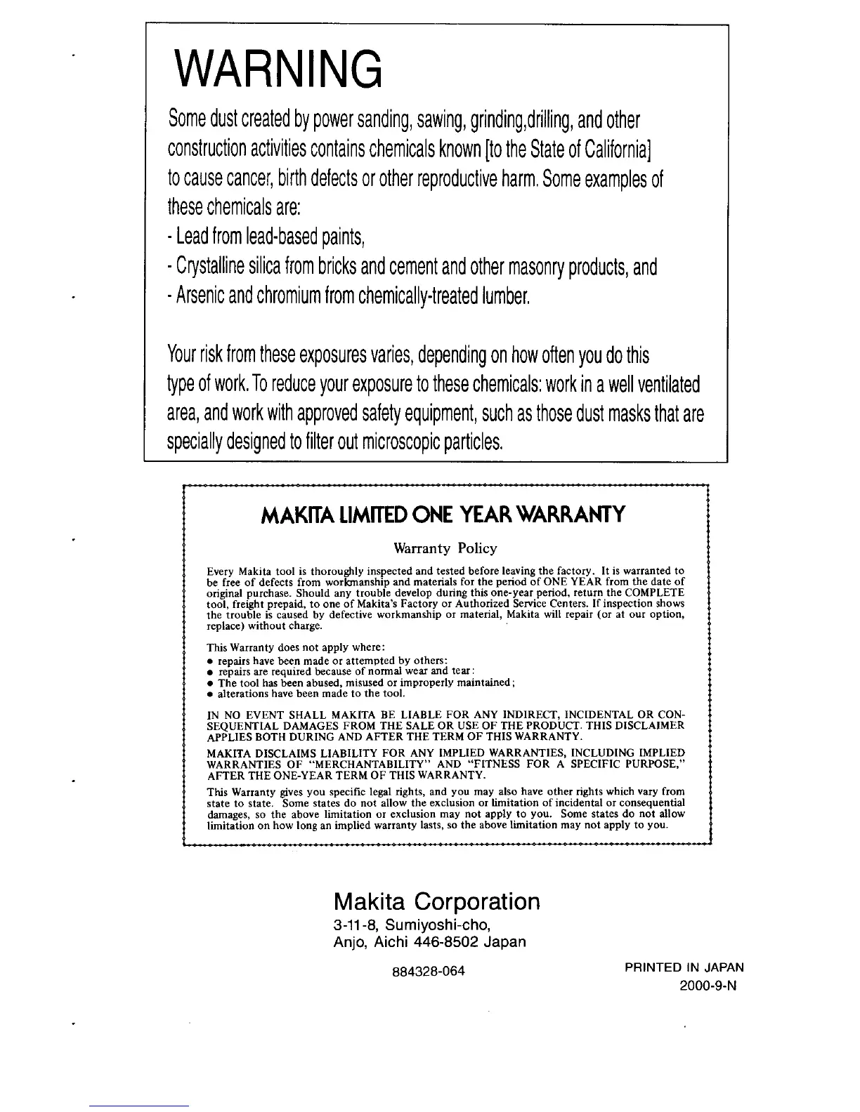 MAKITA DISCLAIMS LIABILITY FOR ANY IMPLIED WARRANTIES, INCLUDING IMPLIED