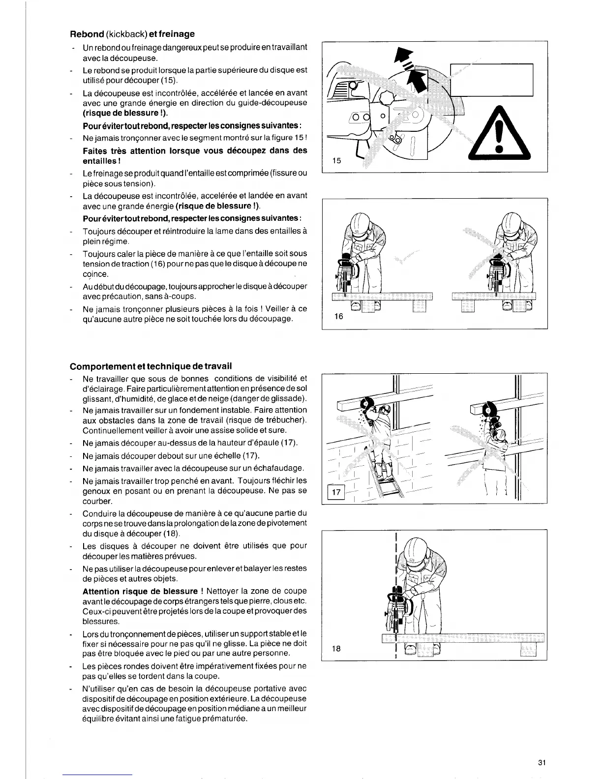 Ne jamais travailler avec la decoupeuse sur un echafaudage.