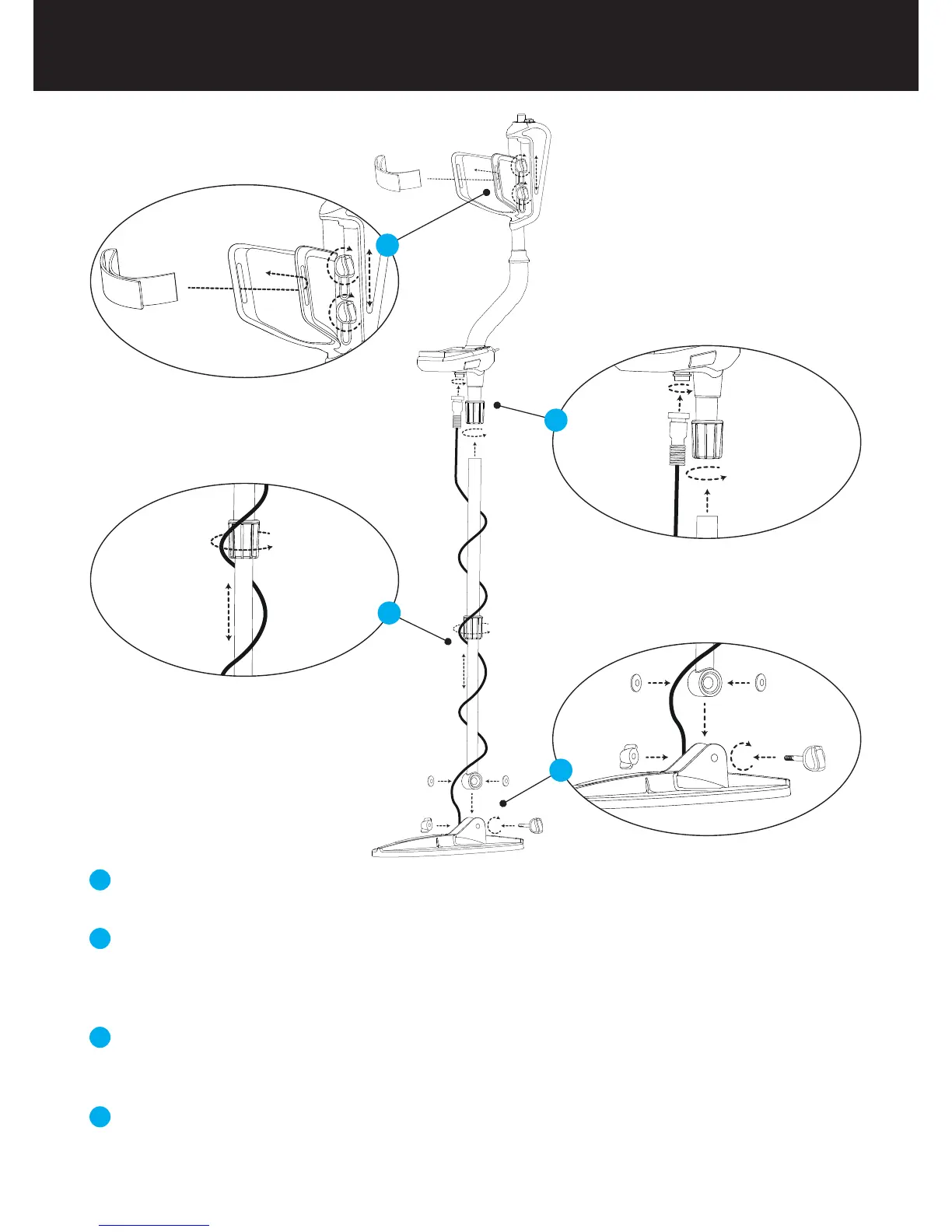 the cable of the search coil on the telescopic shaft without stretching too much. Plug the connector
