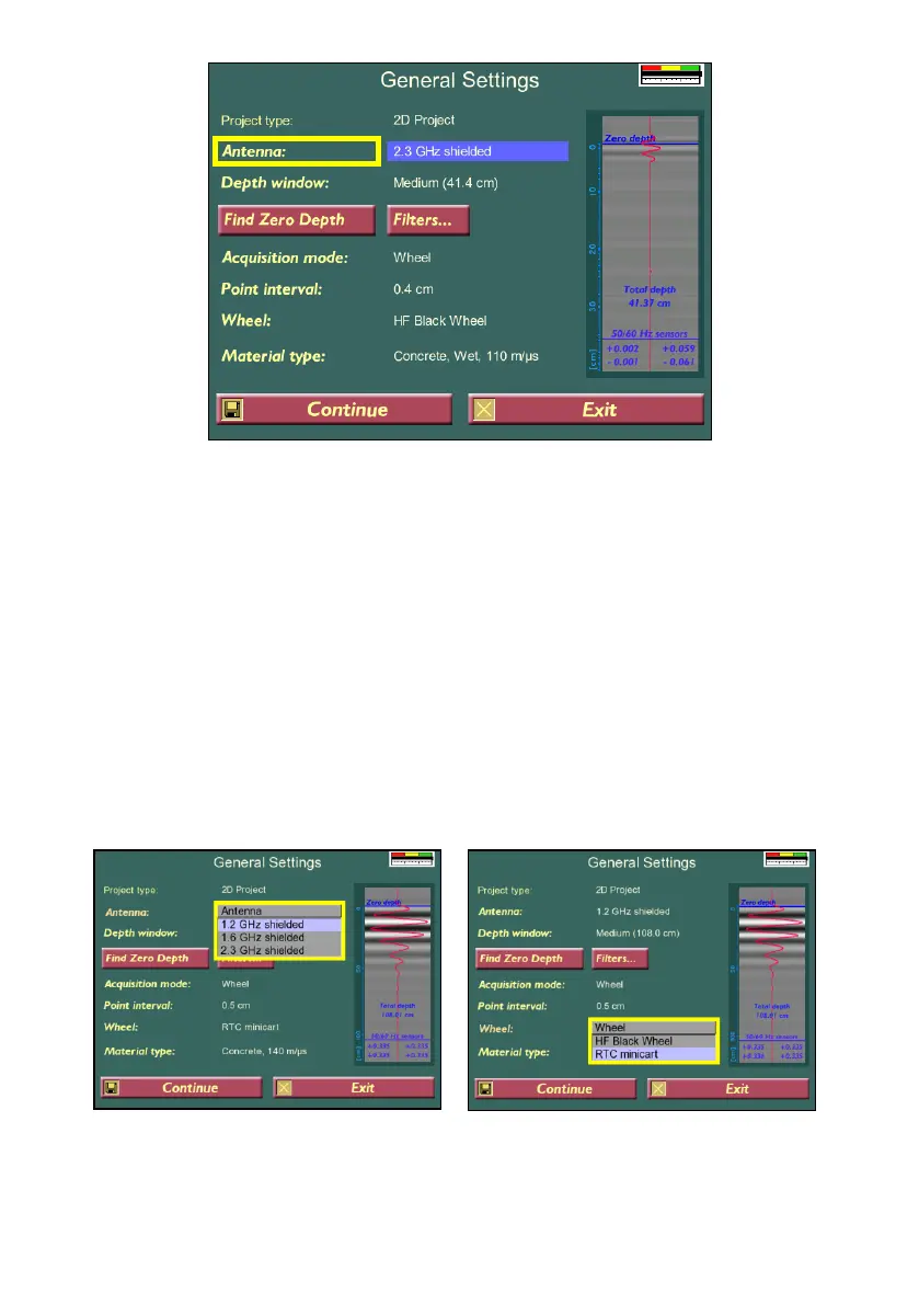 In this menu the options for changing Antenna, Material Type, Depth