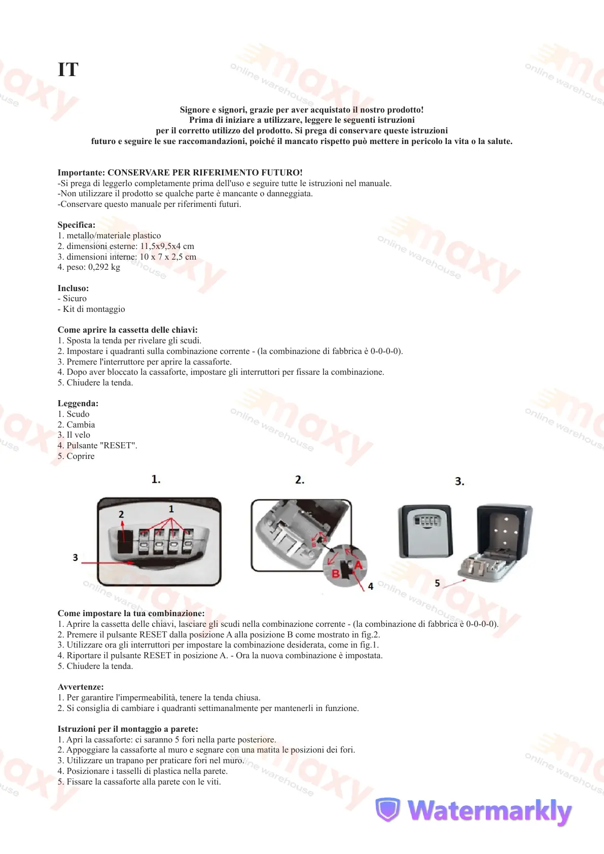 1. Aprire la cassetta delle chiavi, lasciare gli scudi nella combinazione corrente - (la combinazione di fabbrica è 0-0-0-0).