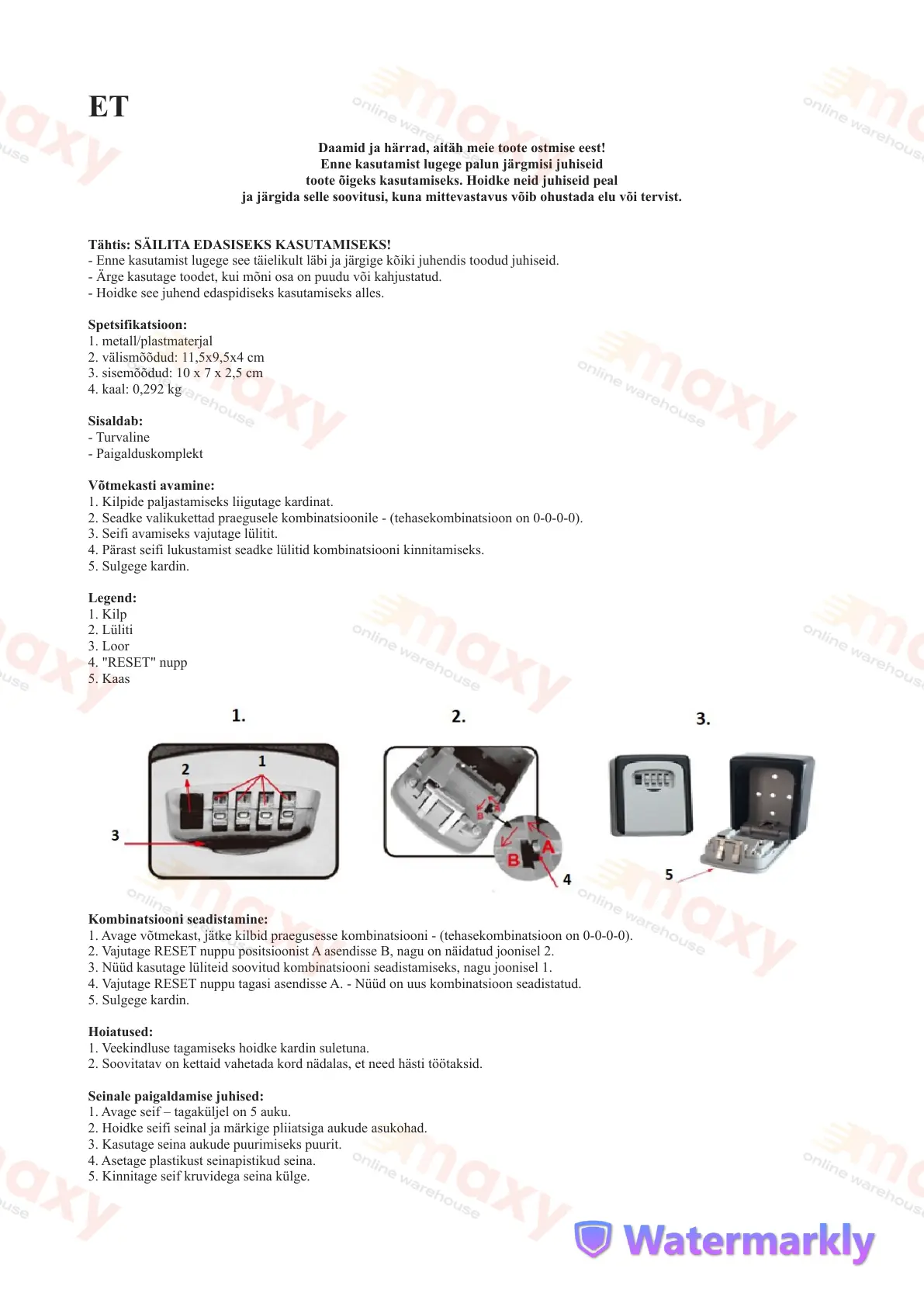 1. Avage võtmekast, jätke kilbid praegusesse kombinatsiooni - (tehasekombinatsioon on 0-0-0-0).