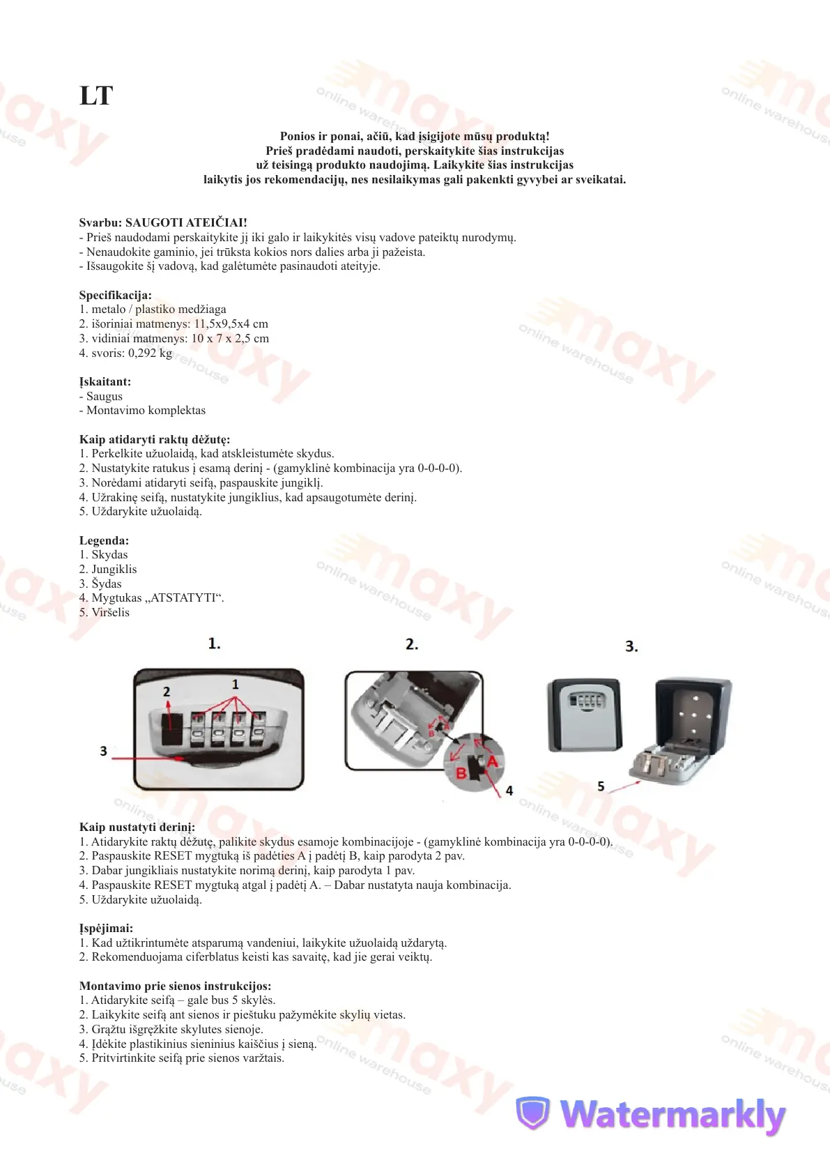1. Atidarykite raktų dėžutę, palikite skydus esamoje kombinacijoje - (gamyklinė kombinacija yra 0-0-0-0).