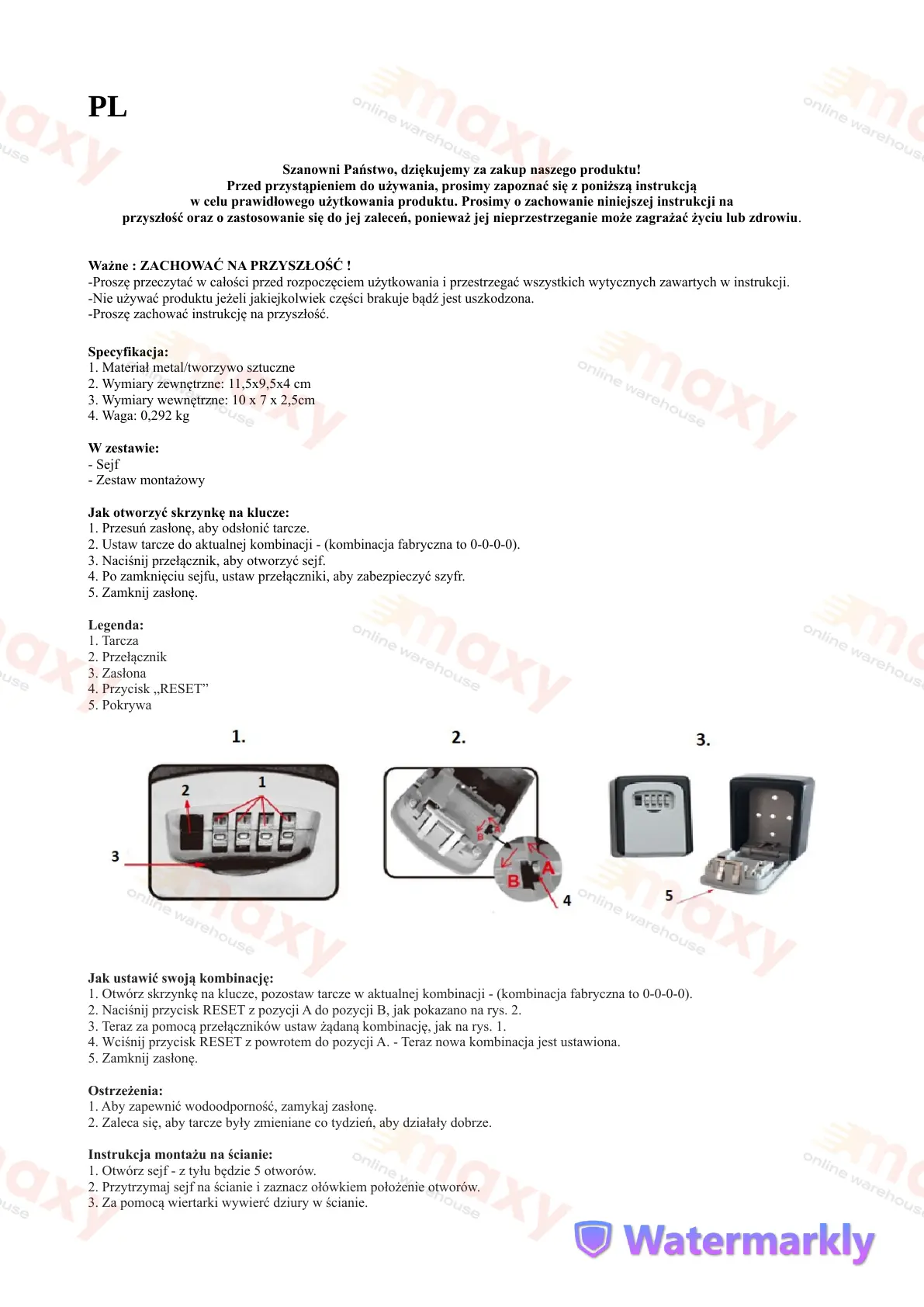 1. Otwórz skrzynkę na klucze, pozostaw tarcze w aktualnej kombinacji - (kombinacja fabryczna to 0-0-0-0).