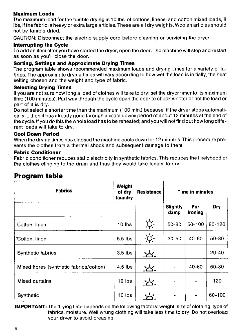 Malber TD 700 - Load and Drying Time Guidance; Drying Cycle Details; Program Table