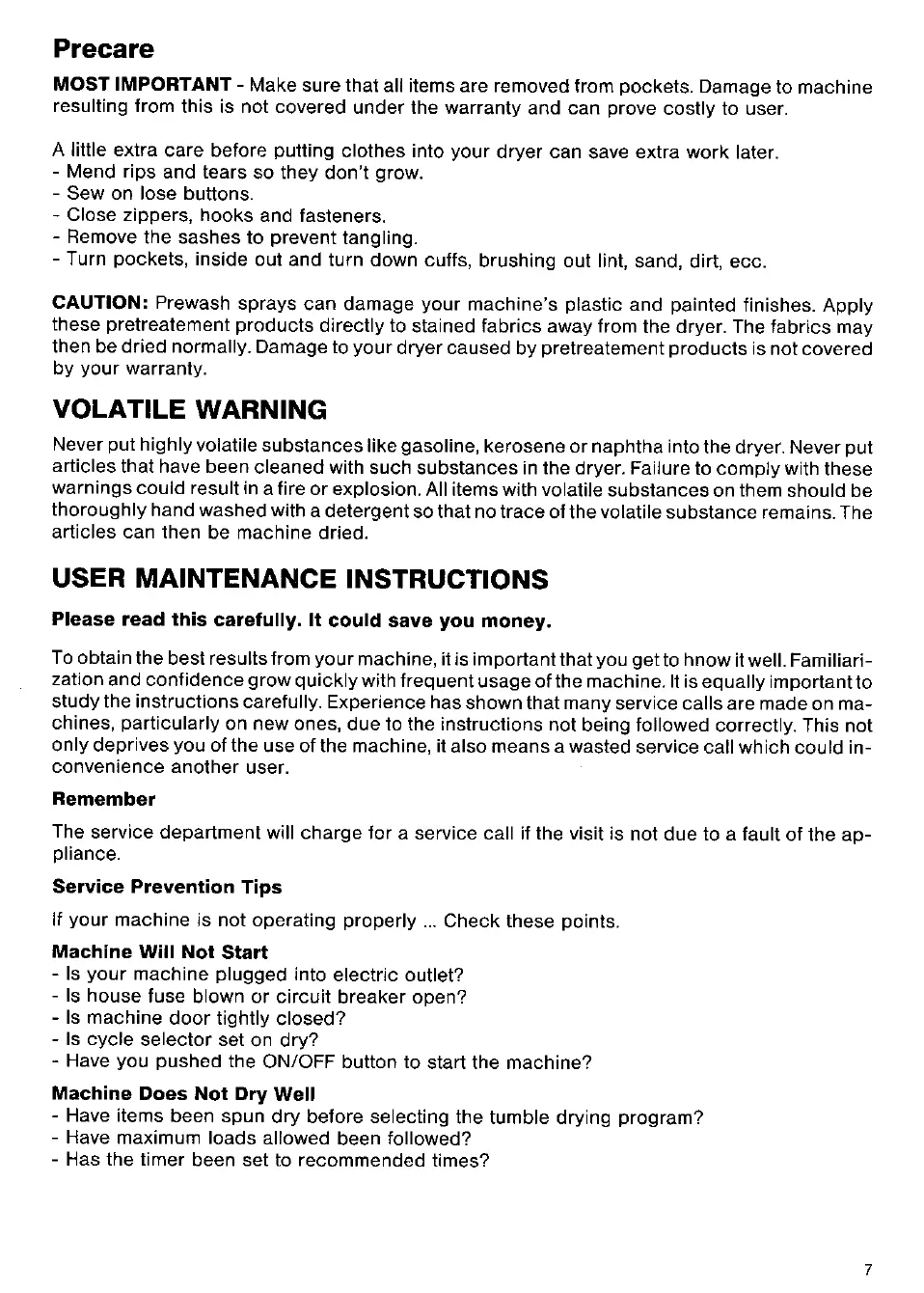 Malber TD 700 - User Maintenance and Troubleshooting; Precare and Fabric Preparation; Volatile Substance Warning; User Maintenance Instructions
