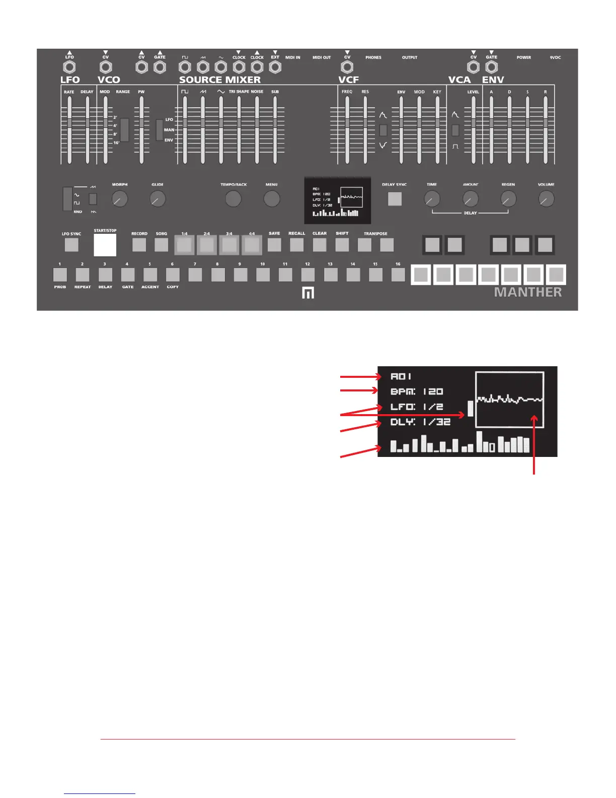 • Save your preset: HOLD SAVE, then select one of the sequencer buttons 1-16 to save to a slot.