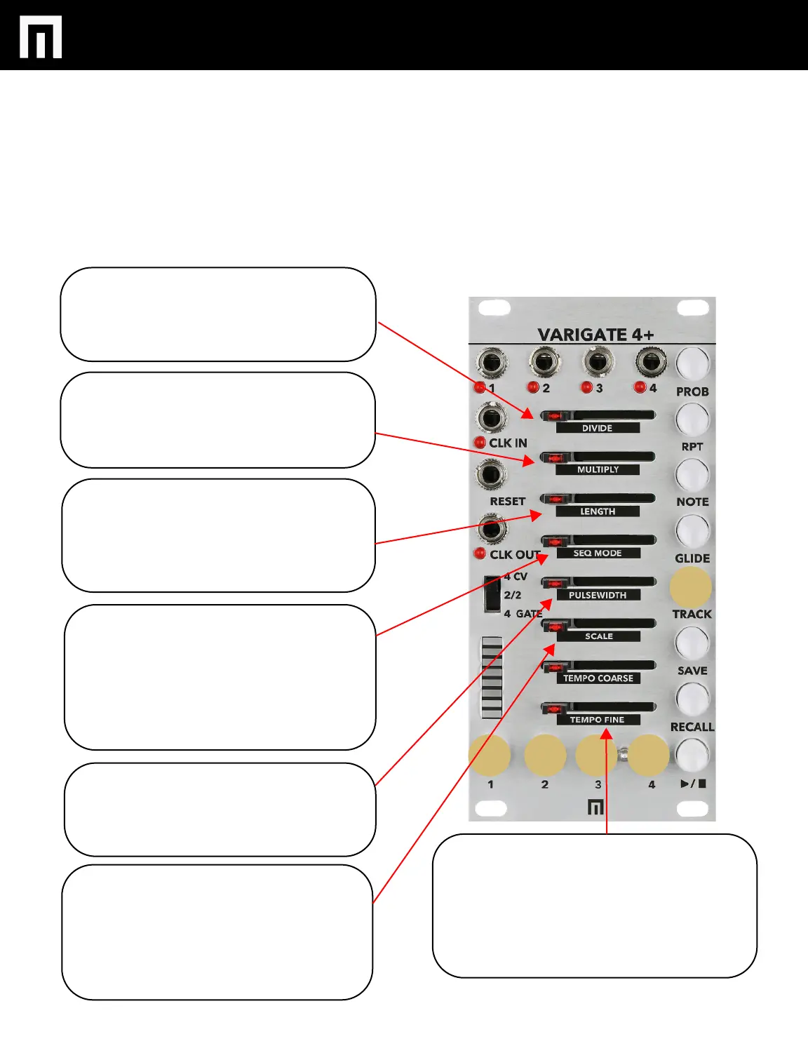 DIVIDE, MULTIPLY, SEQUENCE LENGTH, SEQUENCE MODE, PULSEWIDTH, SCALE, TEMPO COARSE AND TEMPO FINE can