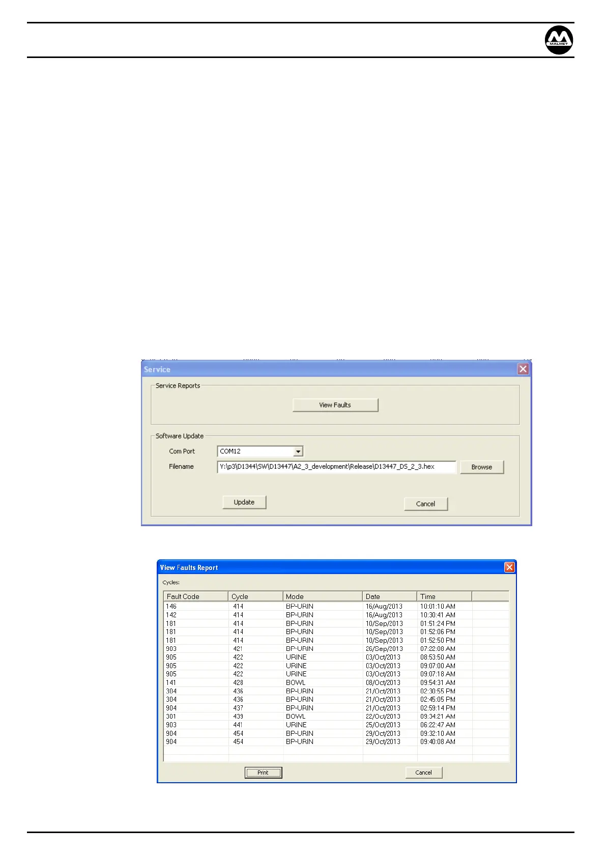 The Service Button opens to a new window. This allows viewing of the Service Fault Report and also uploading of