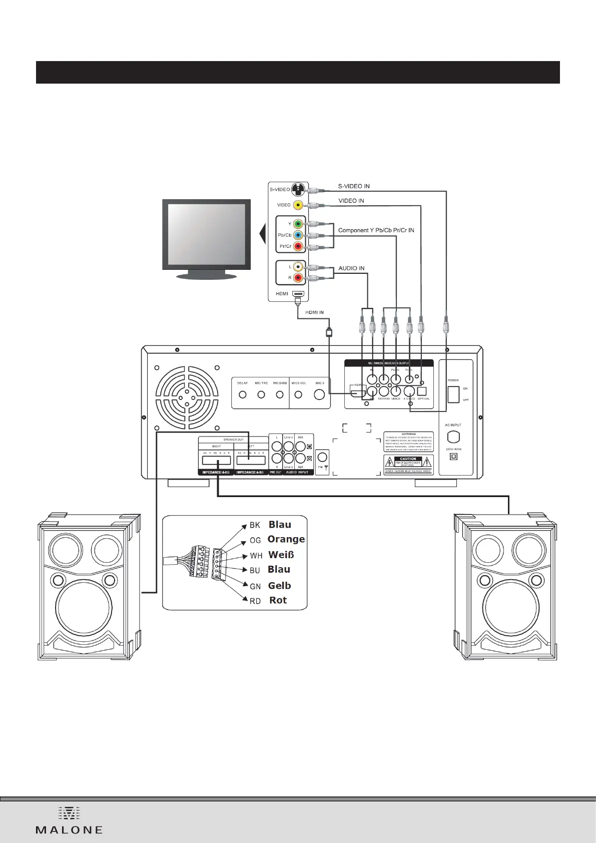 • Verbinden Sie Player, Lautsprecher und Ihr Fernsehgerät nach dem folgenden Schema (stöpseln Sie das Stromka-