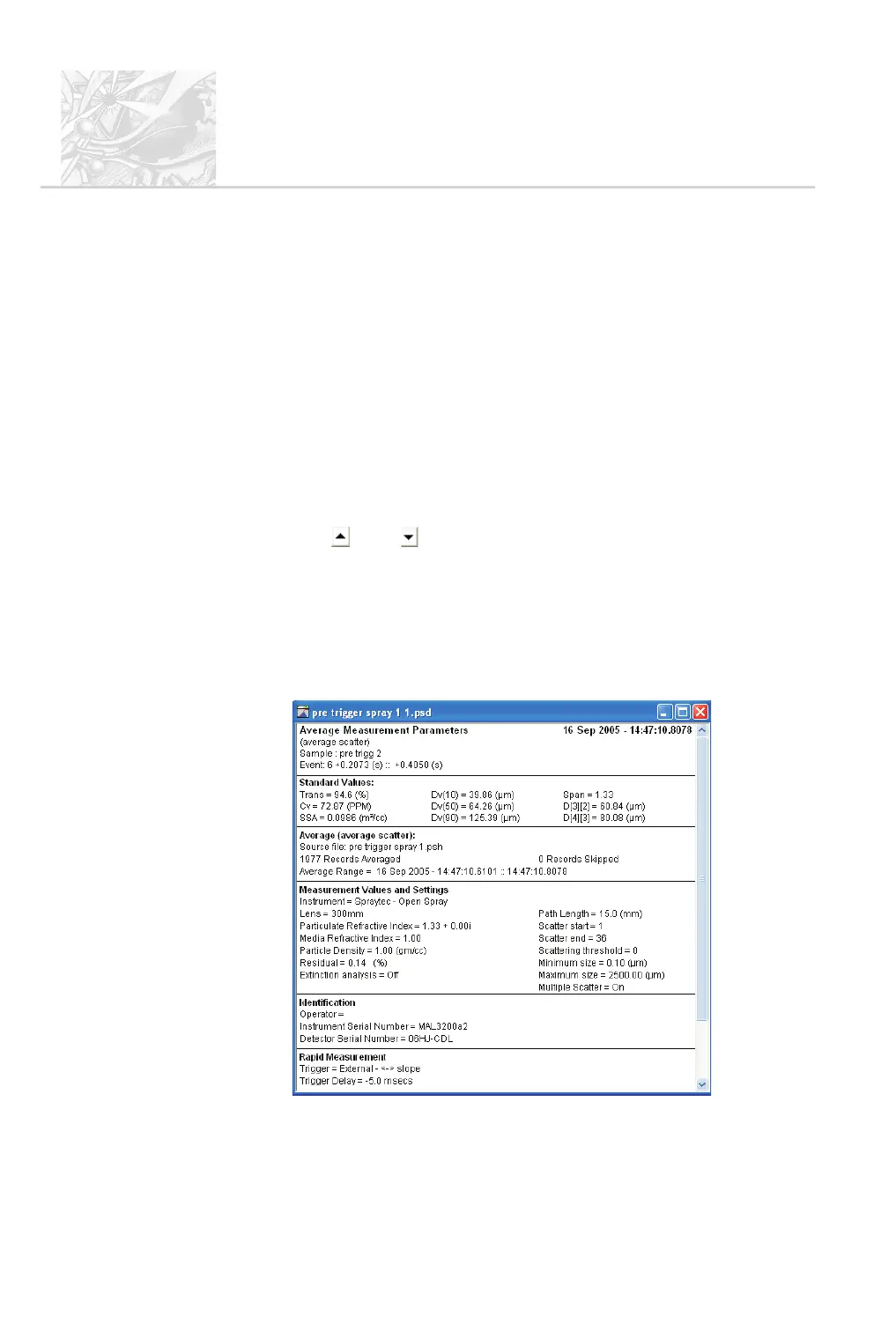 on scattering or size distribution; the line below the heading in the window shows
